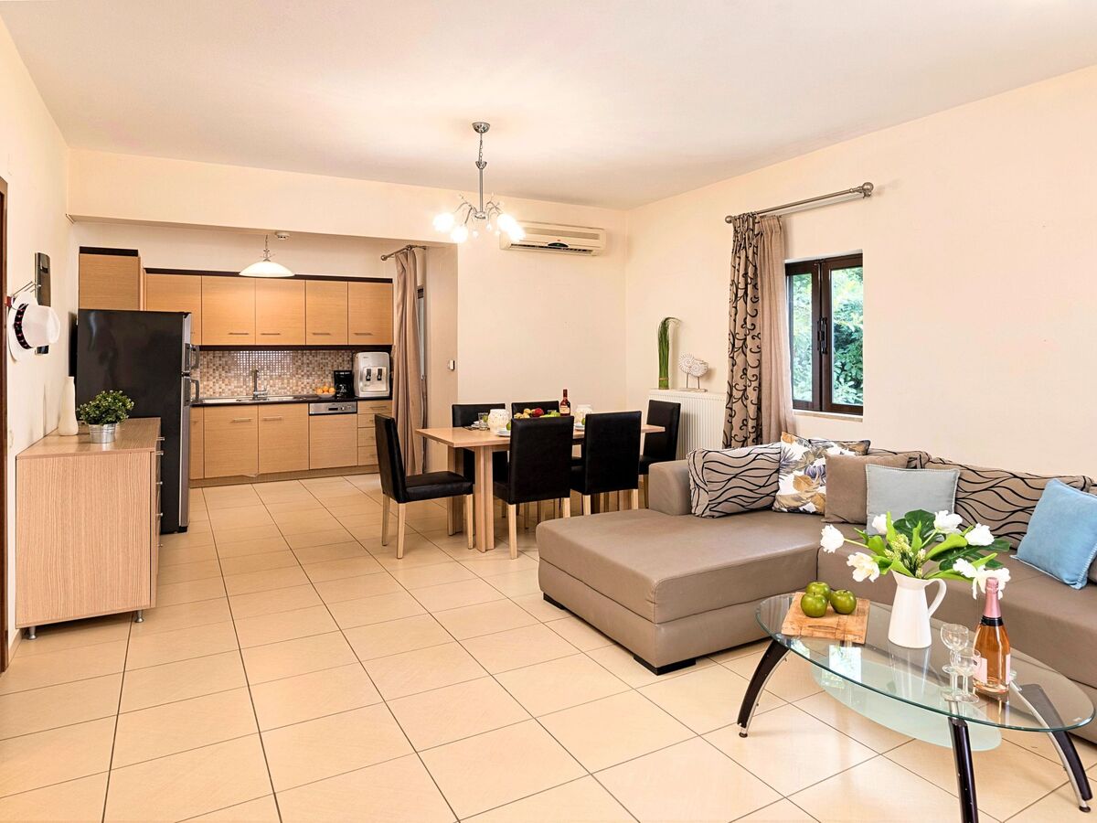● A spacious living room with sofa beds (can accommodate 2 guests) direct access to the terraces and the pool area.