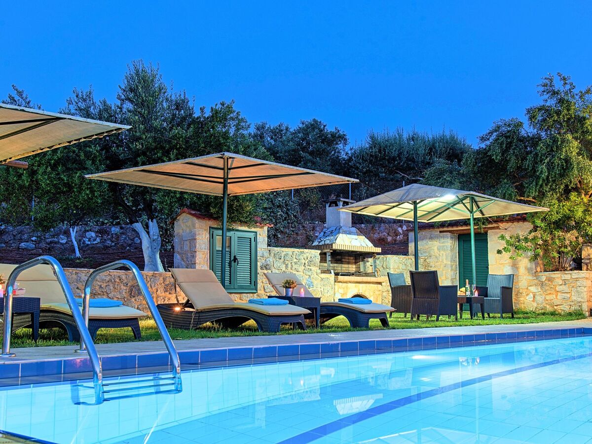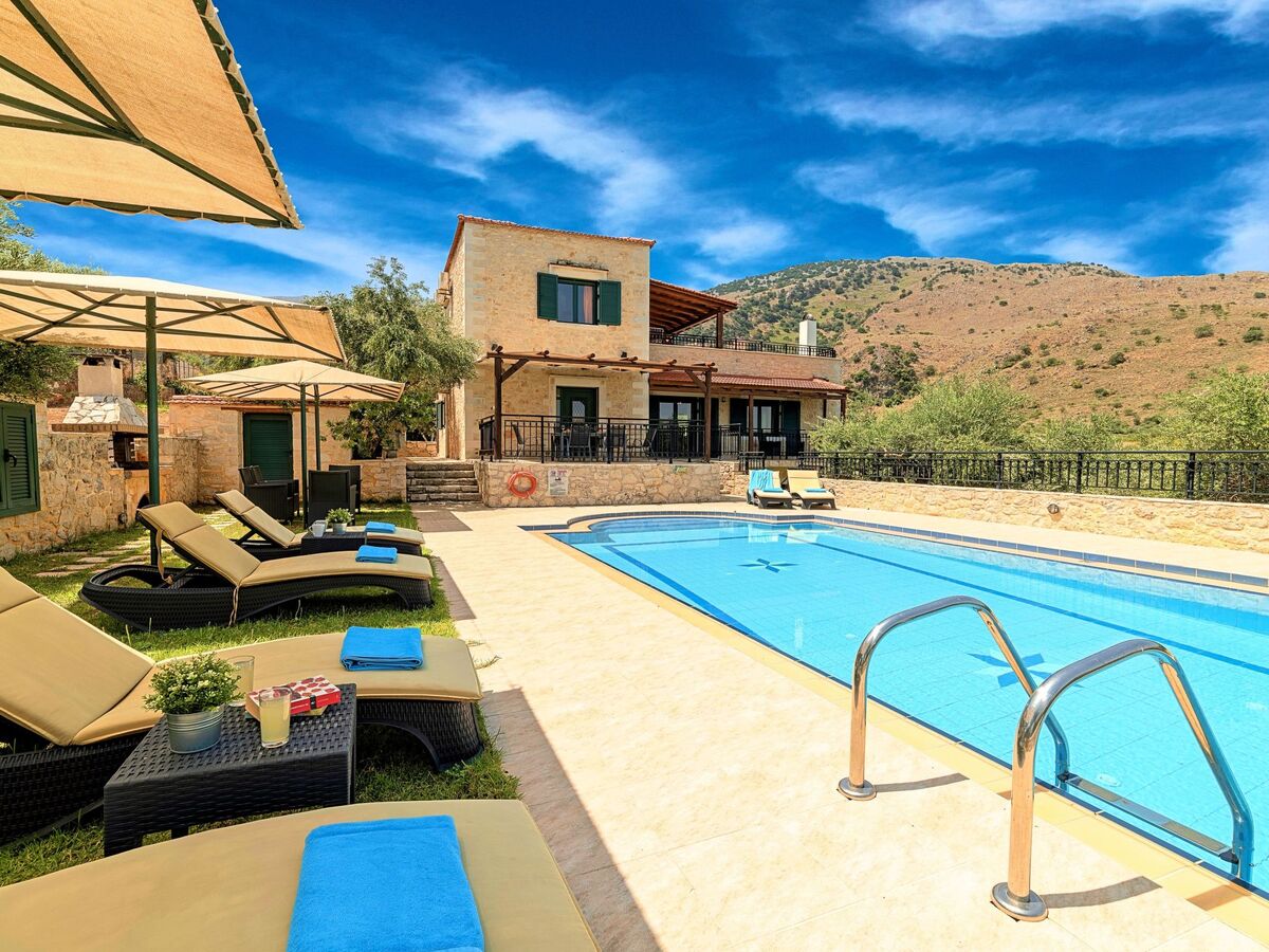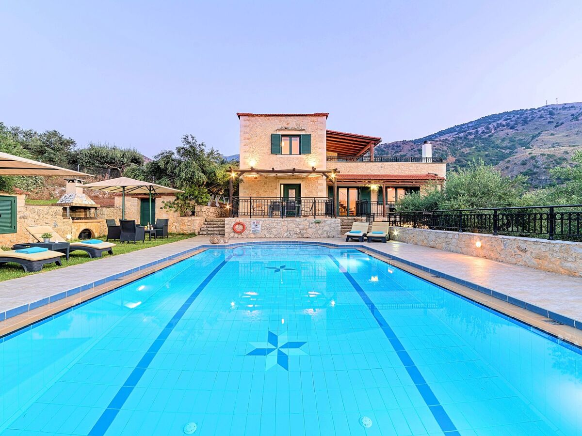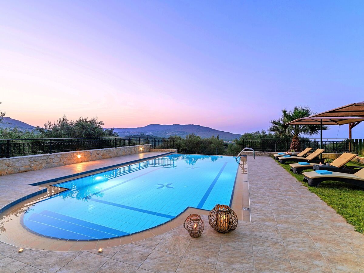 The interior is spacious and very bright while maintaining a cozy feel.Enjoy a magnificent pool area with splendid views of the Aegean Sea and the skyline of Crete.The villa affords privacy blended with sumptuous comfort set amidst a rural setting.Villa Stelios can accommodate up to 12 guests (10 in the bedrooms) and 2 more at the sofas in living room.The villa offers 5 Bedrooms, 3 Bathrooms, 220sqm Living Area, 6.000sqm plot surface, private pool 60sqm