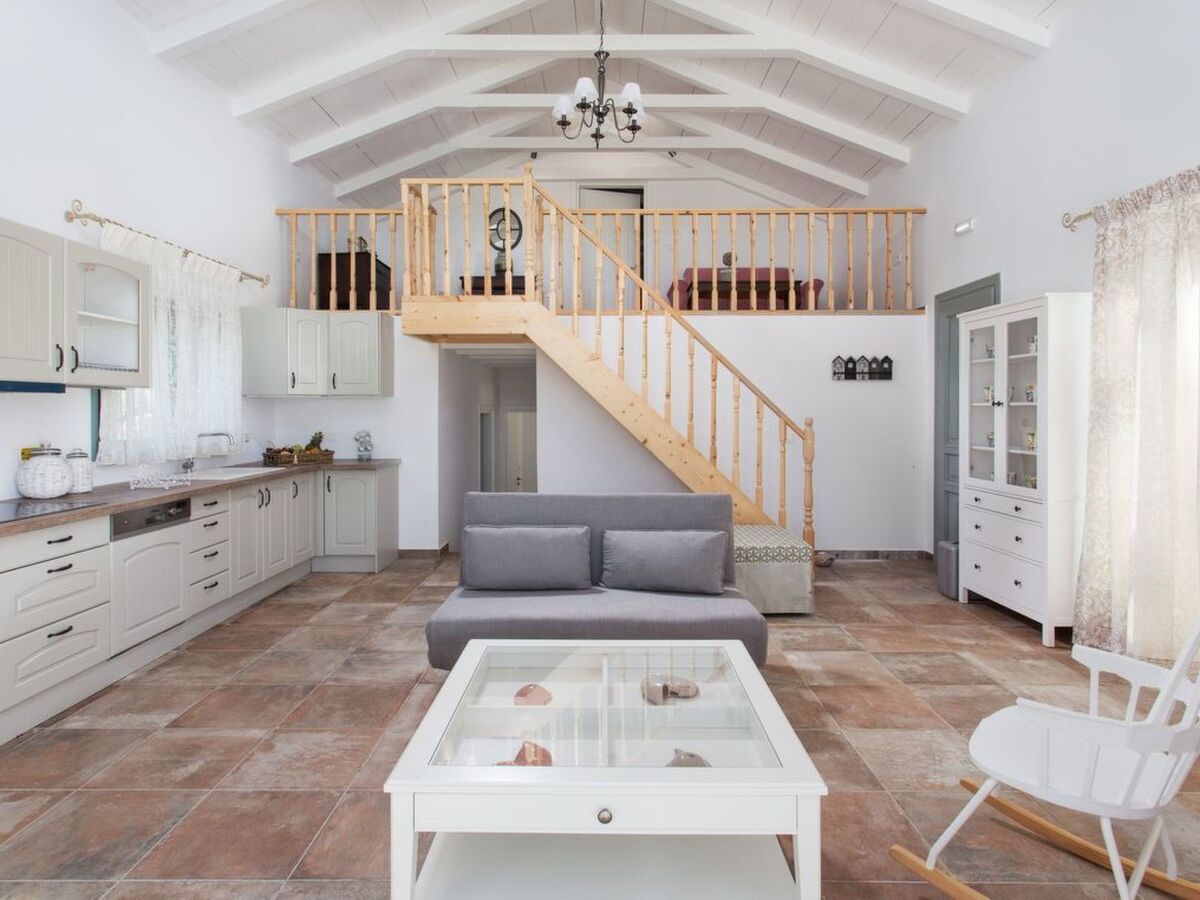The main entrance of the villa leads to the 50sqm living room with a modern fully equipped kitchen and dining table, all in country style.