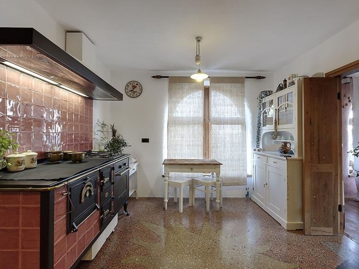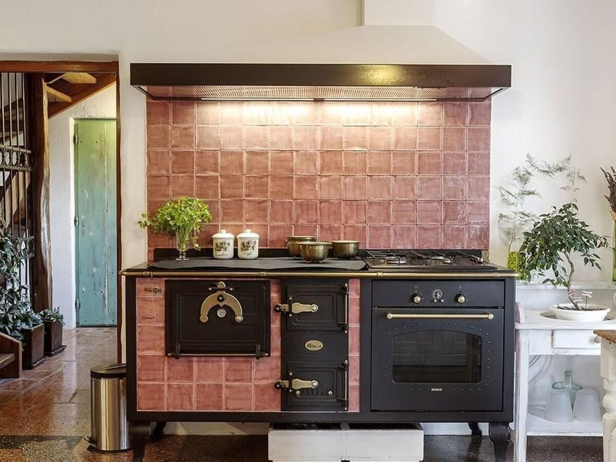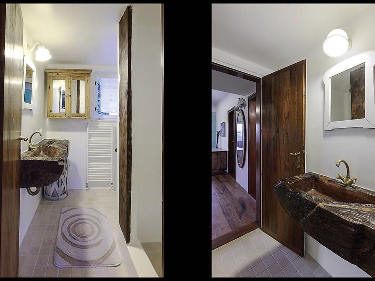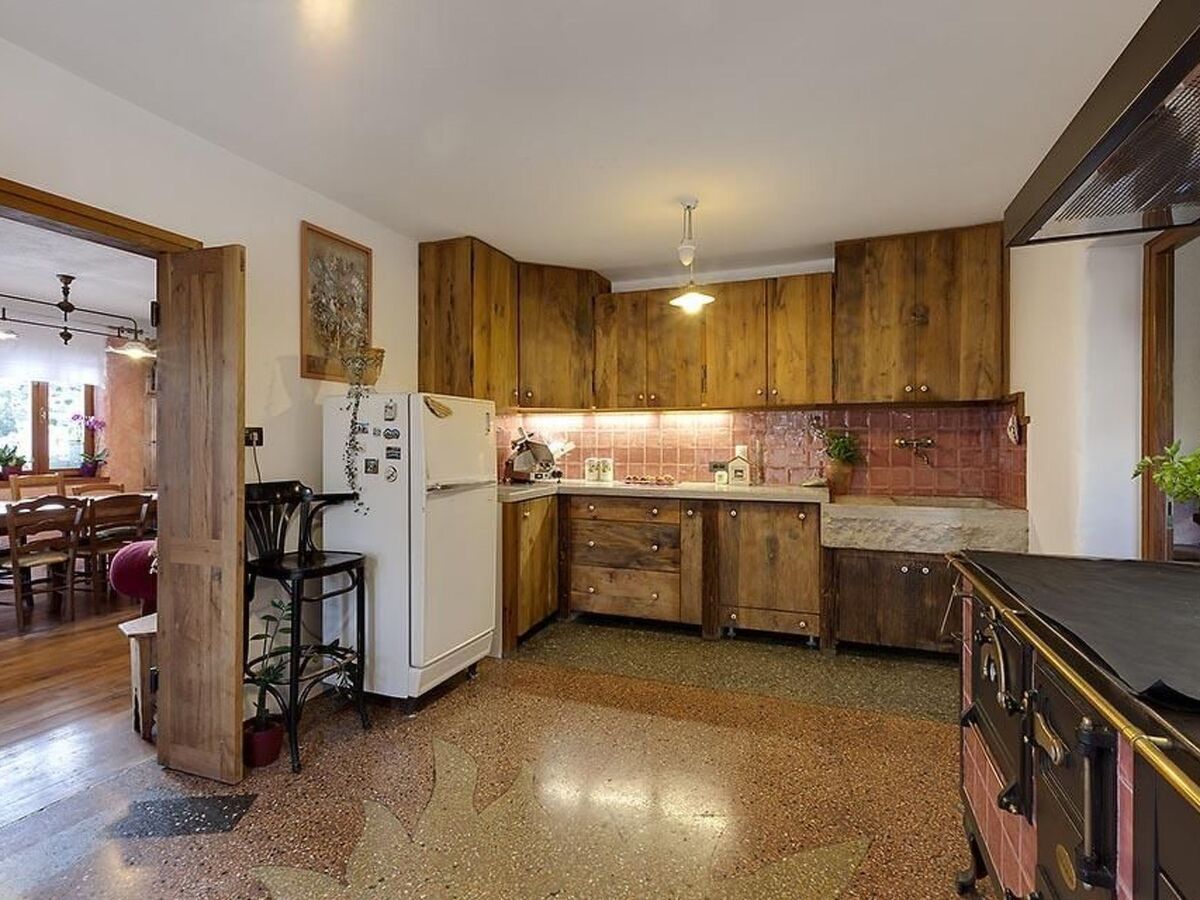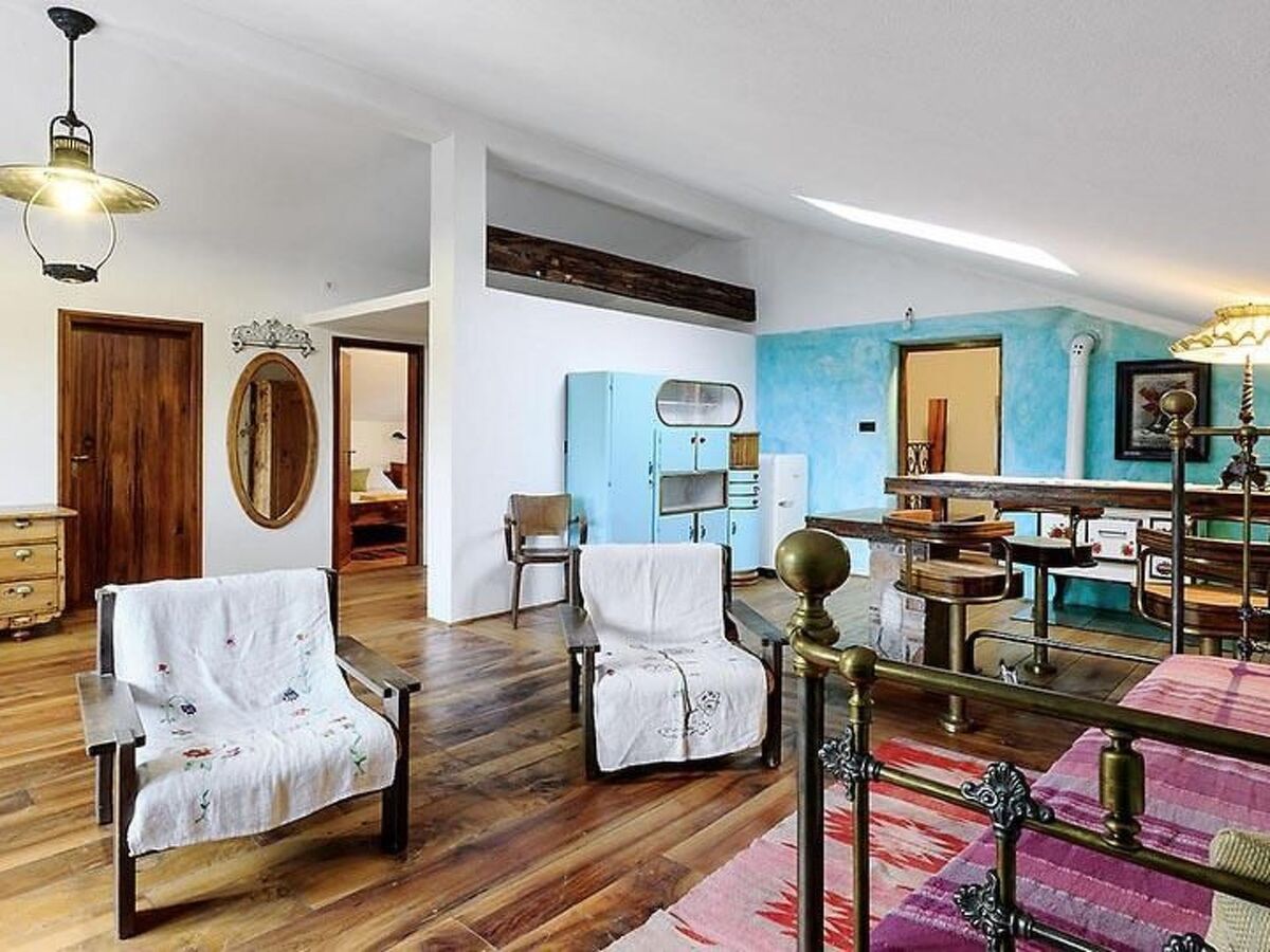 The kitchen next to it is fully-equipped with a stove, oven, microwave, coffee machine, fridge and dishwasher and the spacious living room has a variety of seating and a handmade wooden bar with matching stools and decorative lamps, an ideal gathering place to end the day together.