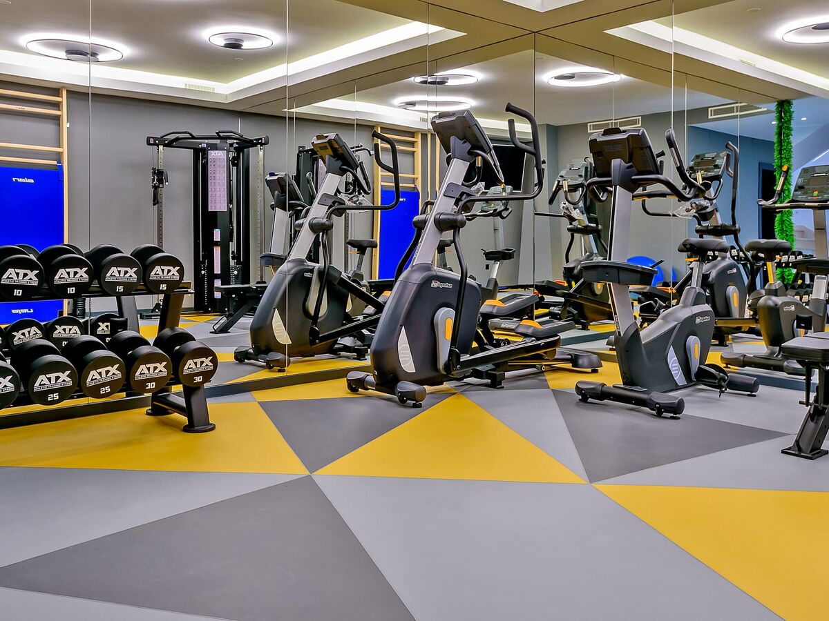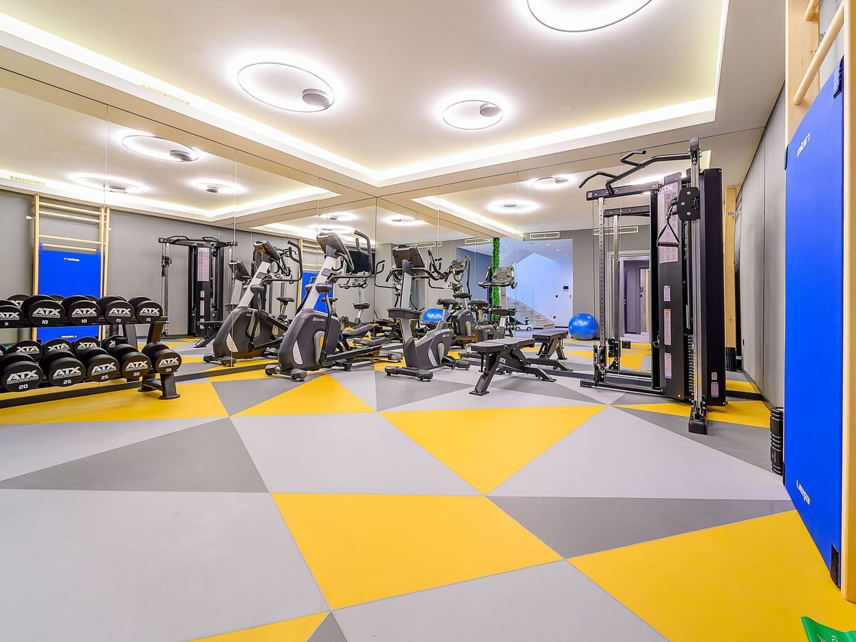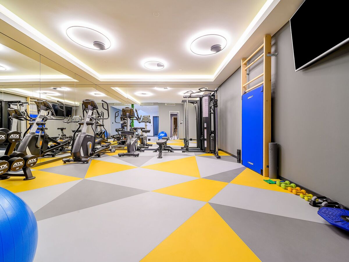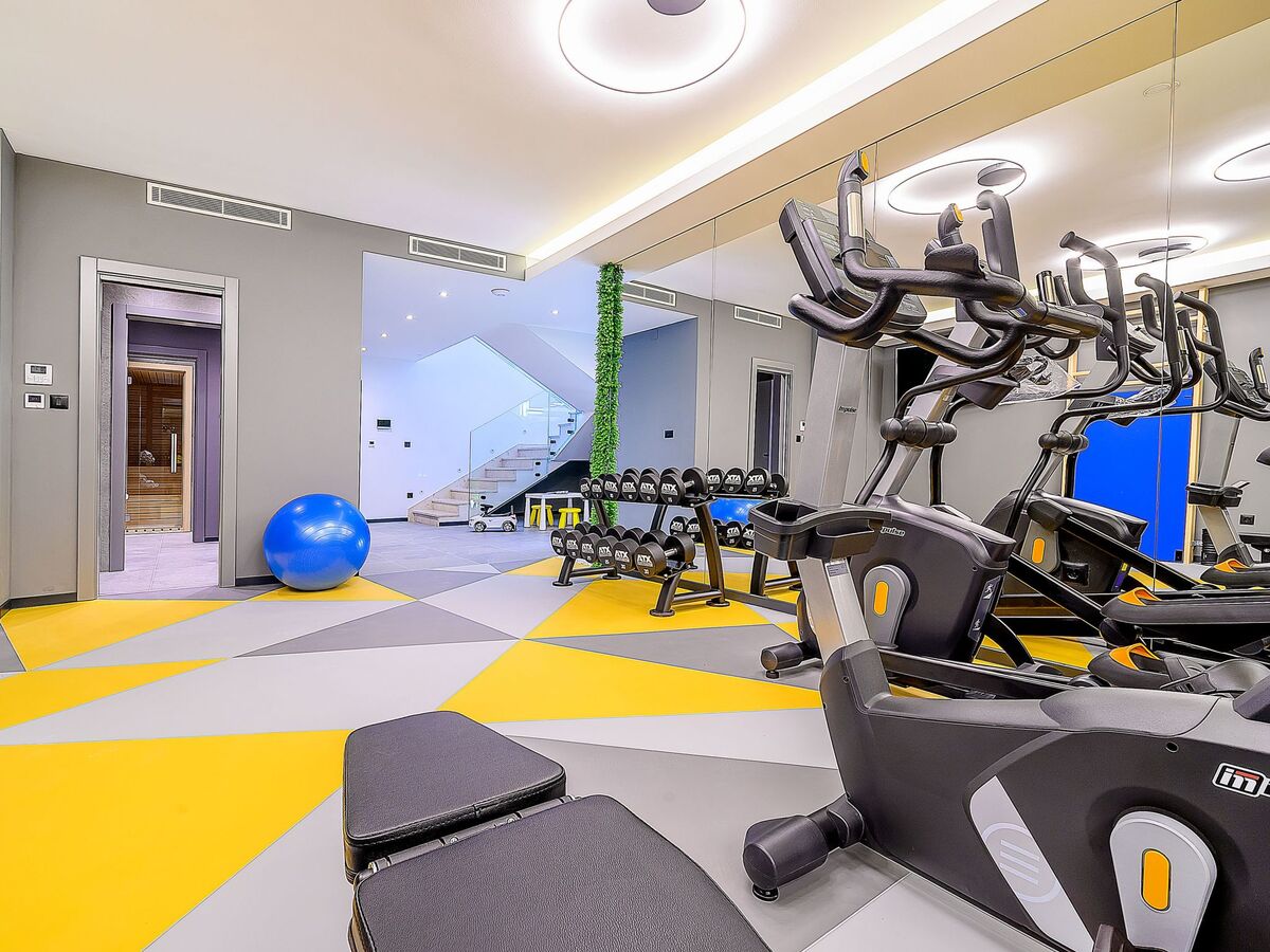 a well equipped gym area, sauna with shower, toilet, and laundry facilities.