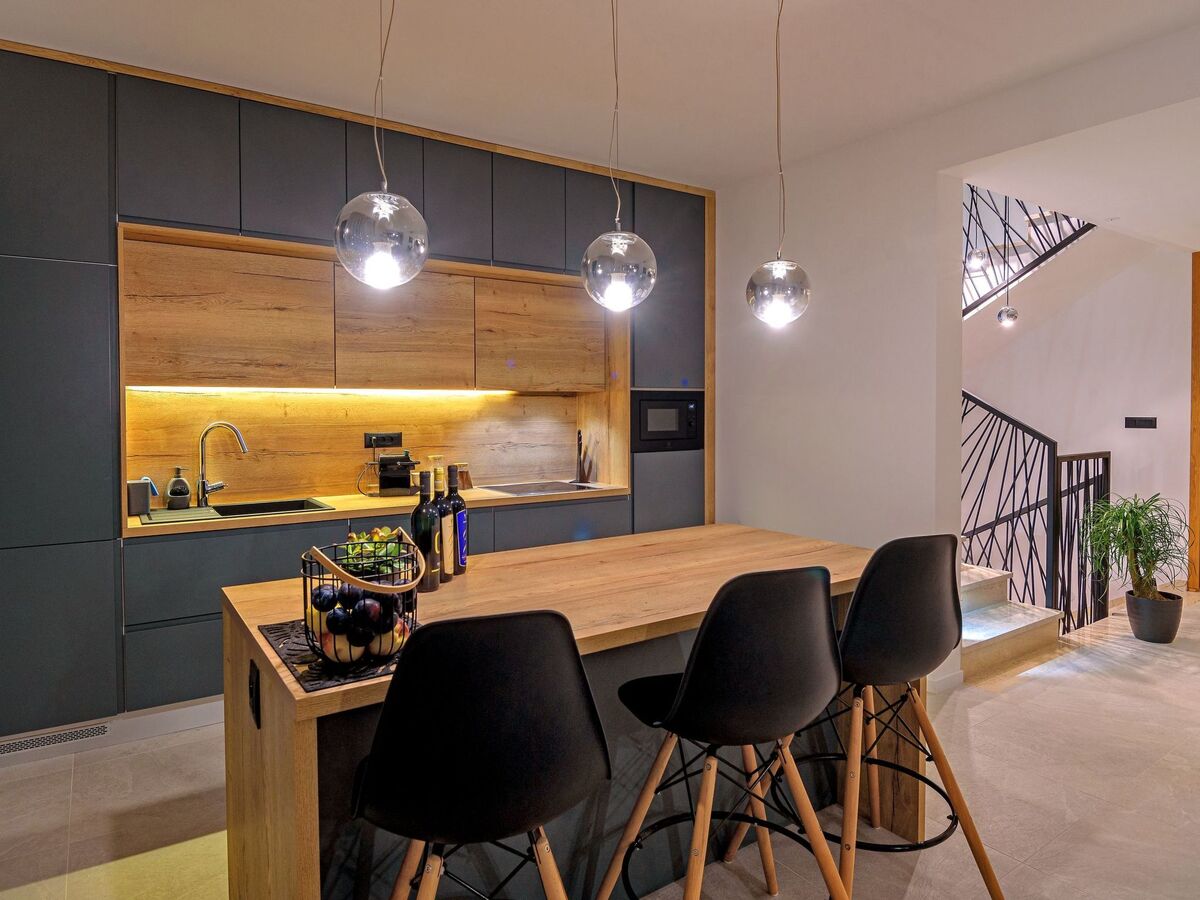 A top-notch kitchen connects to the dining area with an indoor dining room table.