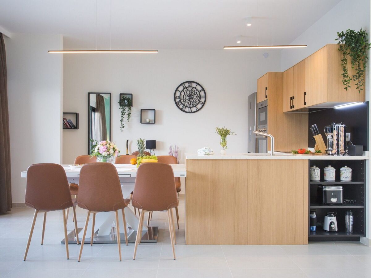 L'intérieur luxueusement conçu, riche en tons chauds, crée l'ambiance d'une maison de vacances confortable et aérée où chaque invité se sent le bienvenu.