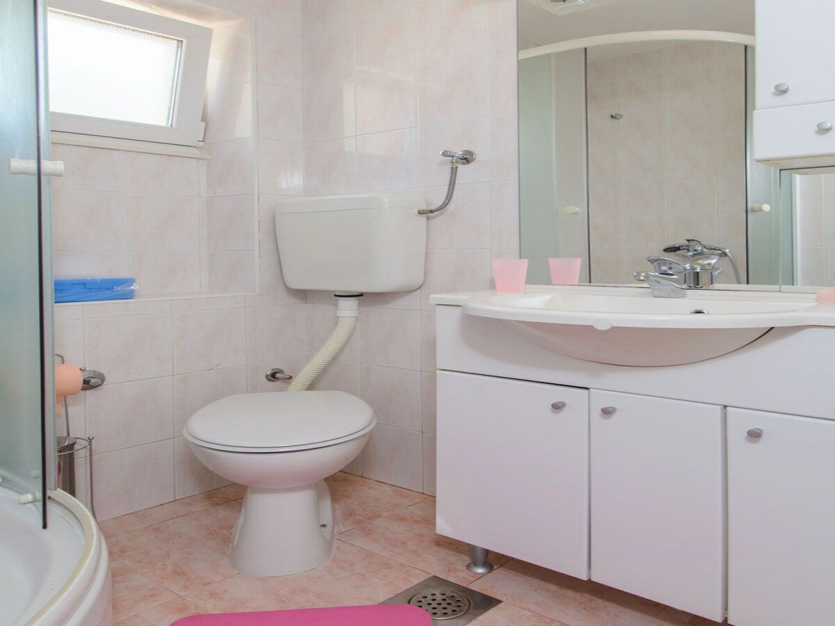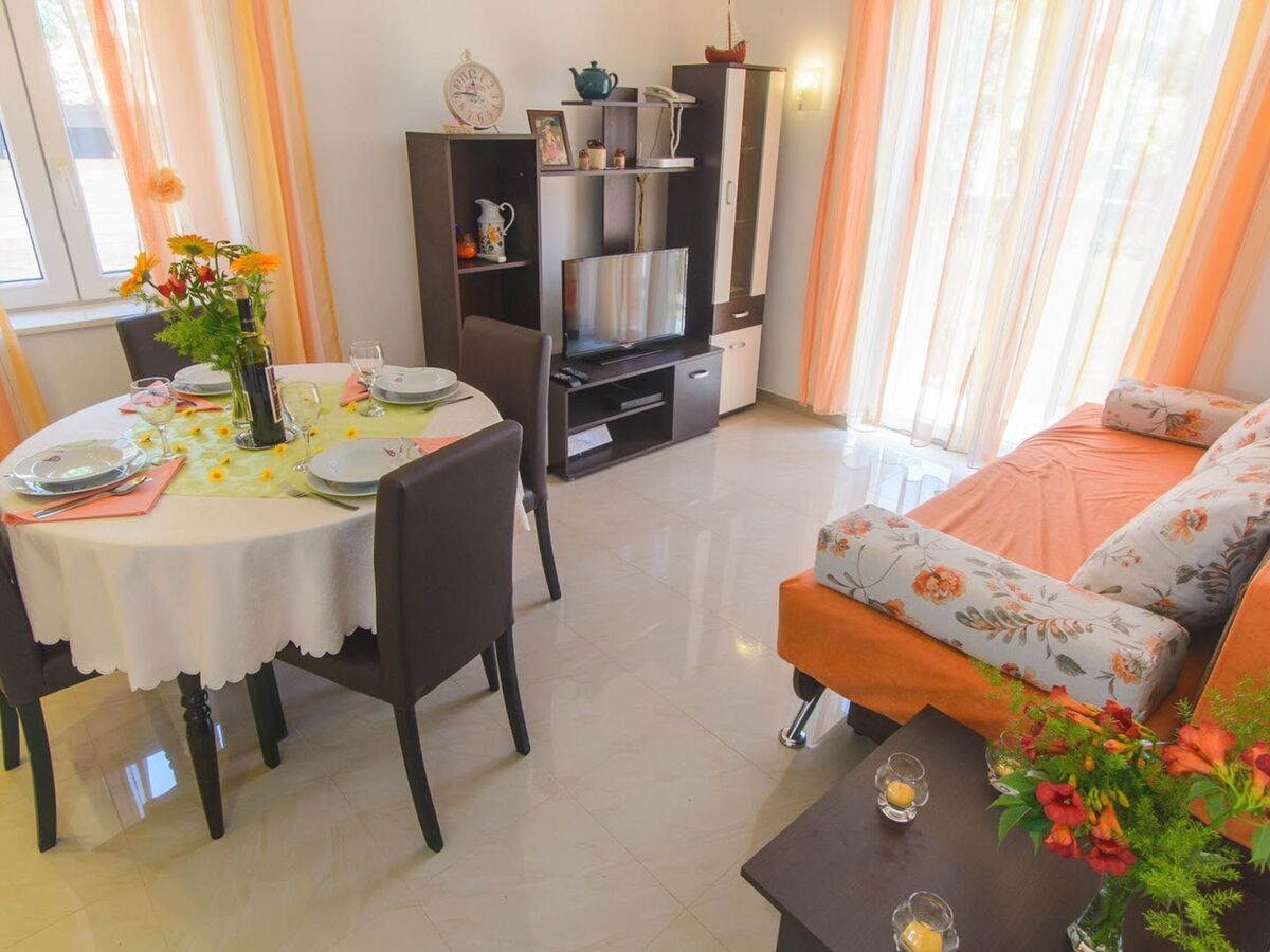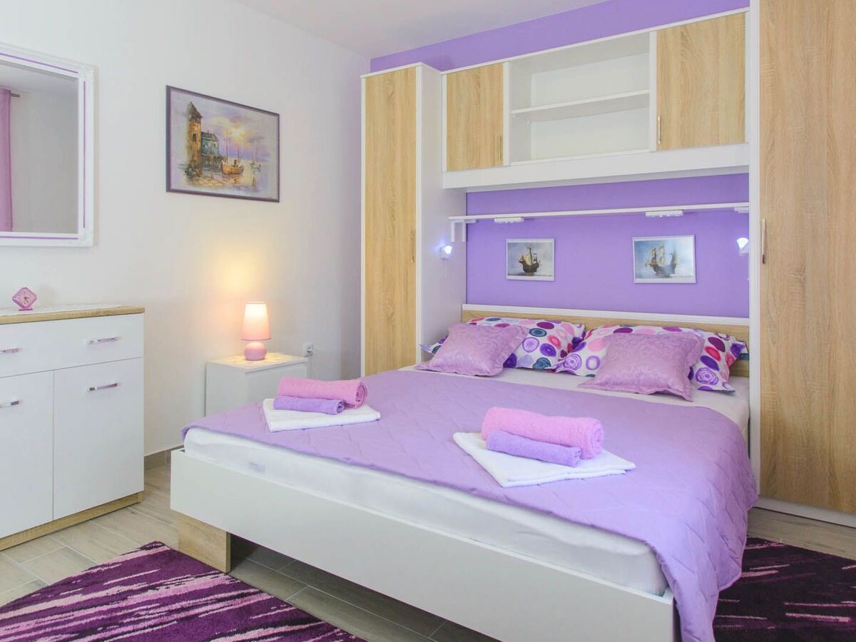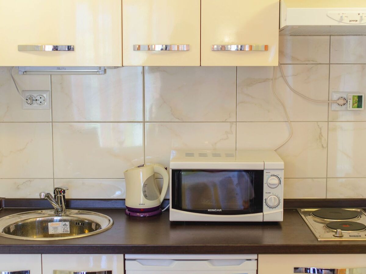 Arrangement of rooms and equipment:Bedroom 1: double bed (160 x 200 cm), wardrobe, linenBedroom 2: 2 single beds (90 x 200 cm), wardrobe, linenBathroom: shower, WC, sink, washing machine, hair dryer, towels, toiletriesLiving room / dining area: air condition, sofa bed for 1 person, cable TV, dining table and chairs for 4 persons, access to gardenKitchen equipment: stove, hood, mini-fridge with freezing compartment, microwave, electric kettle, coffee maker, toaster, barbecue equipment