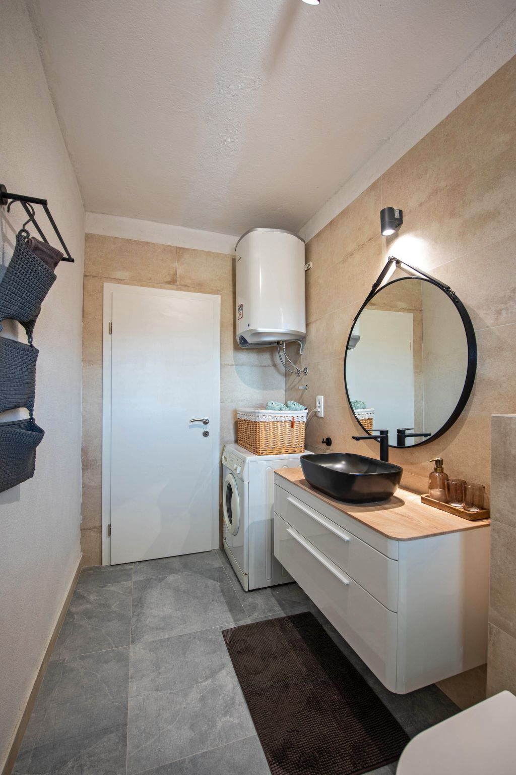 Next to it the built-in kitchen comprises a four-zone gas stove, an electric oven, a fridge with a freezer compartment, a microwave, a toaster and even a washing machine.