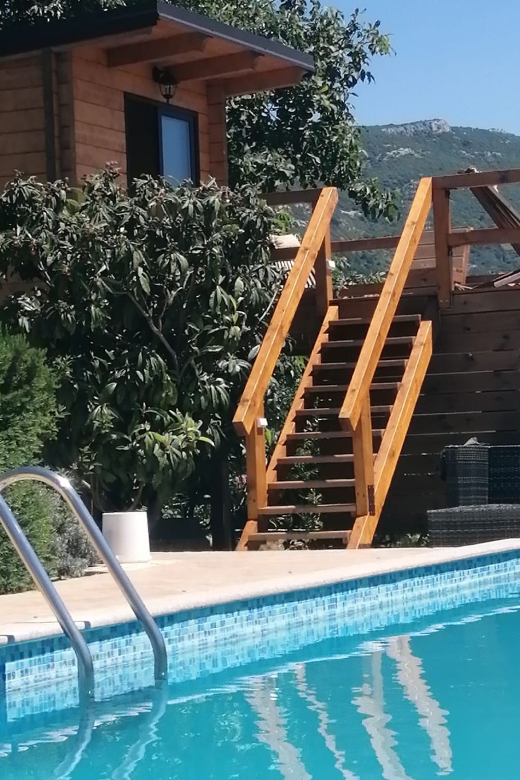 Le rez-de-chaussée se compose d'une cuisine ouverte bien équipée et d'un salon avec accès à la terrasse spacieuse avec mobilier d'extérieur donnant sur le jardin et la piscine, d'une salle de bains moderne avec baignoire et d'une chambre avec des lits superposés, idéale pour les enfants.