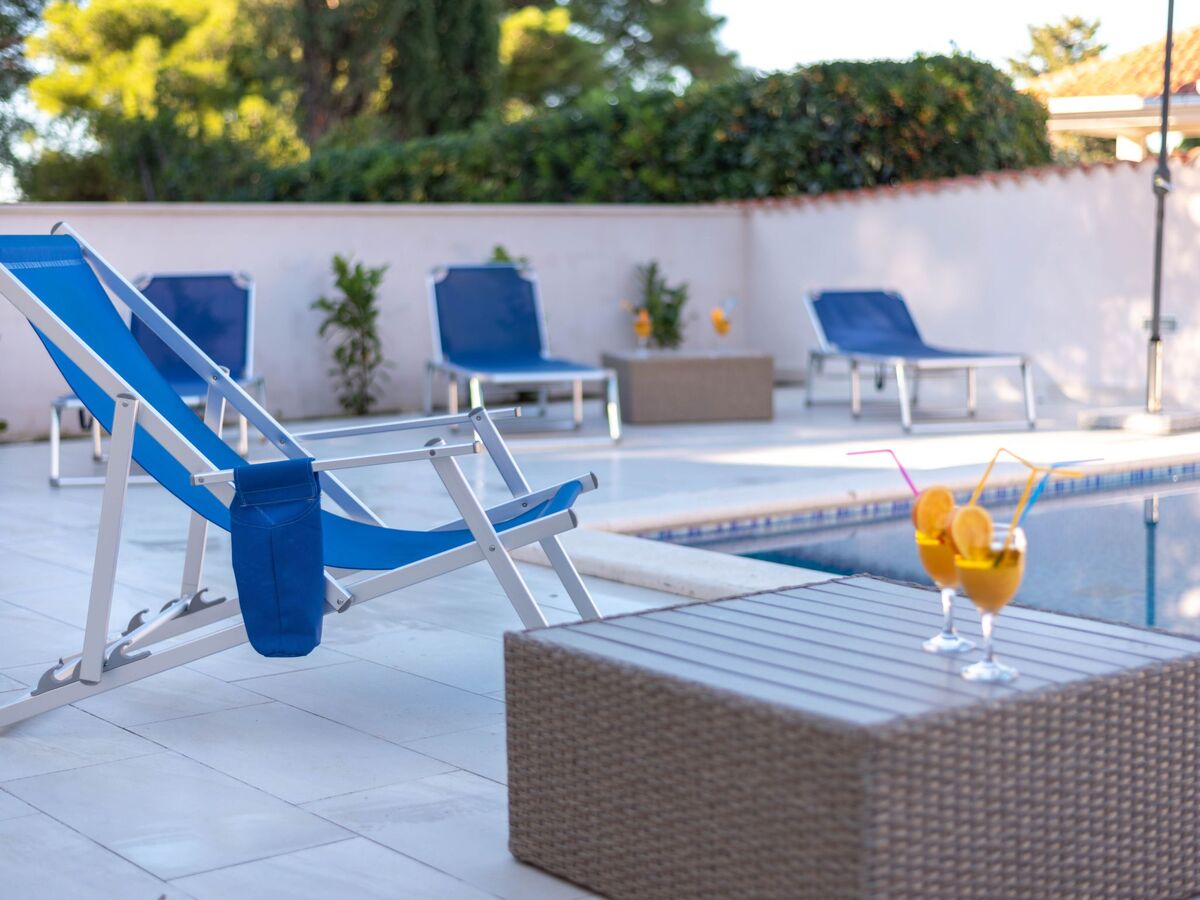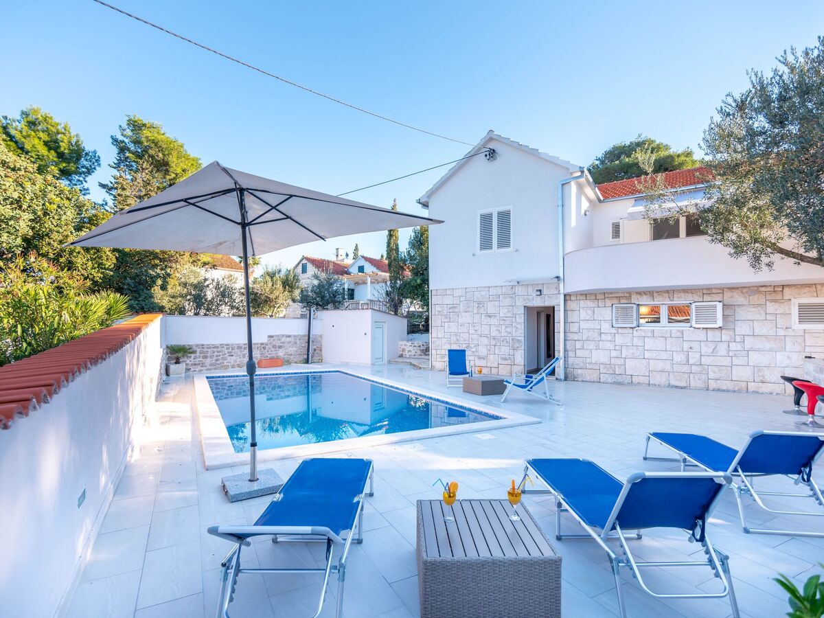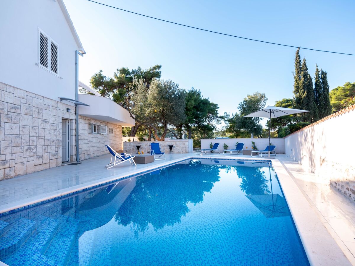 Villa has big POOL of 30 m^2 in front of it with sunbeds and siting area around it.