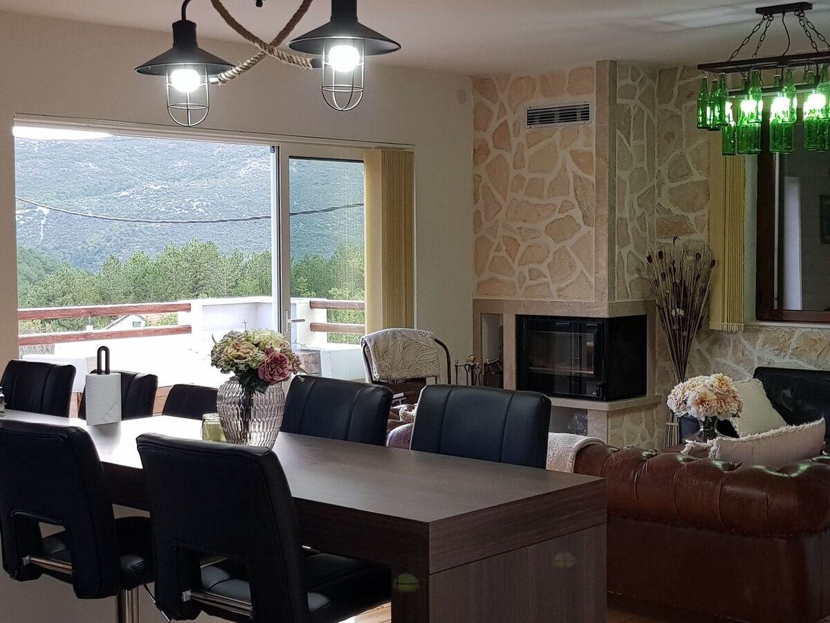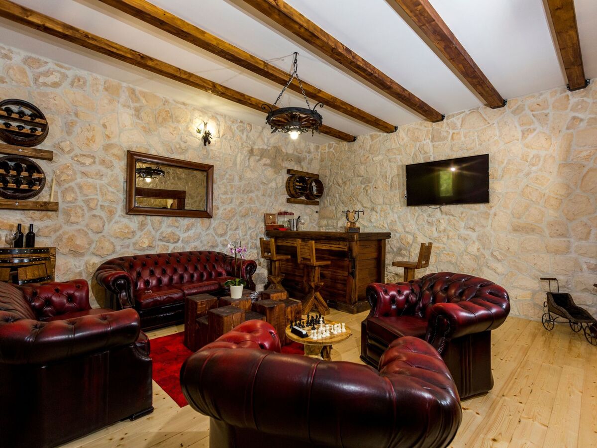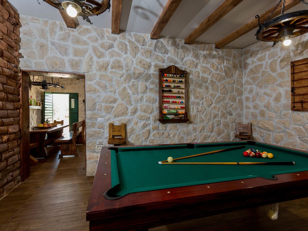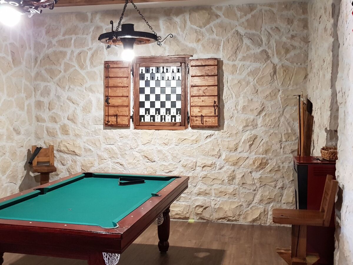 Ground floor is 75 m2 large living room ( Dalmatian stone/wood built "konoba") with luxury interior, large billiard table , luxury seating furniture , large flat TV and audio system plus eating table.