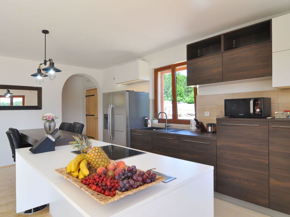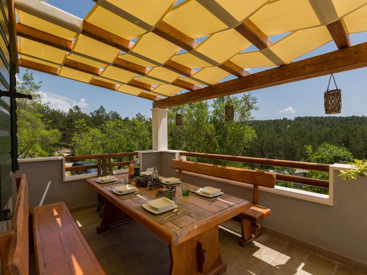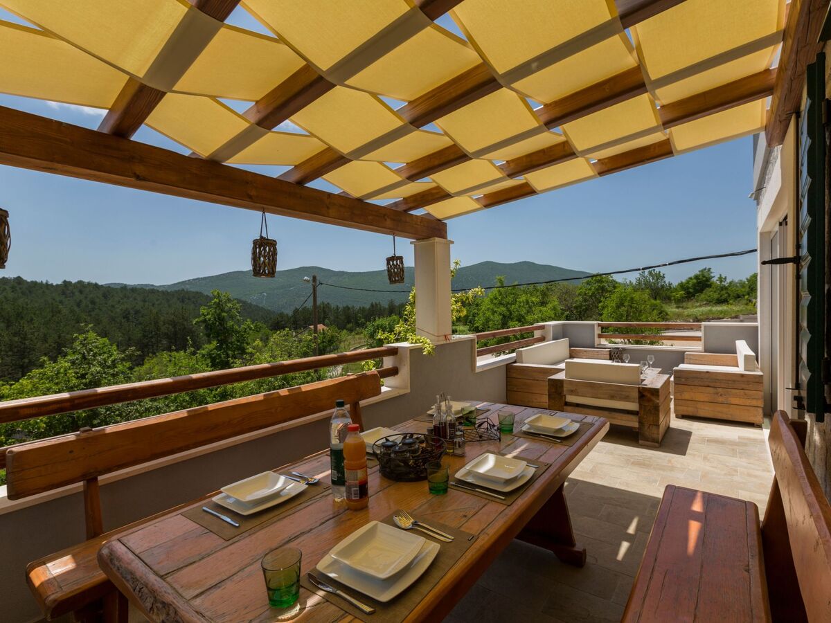 Large balcony (30 m2) offers a outside lounge seating set and large kitchen table so guests can have lunch on open space or just enjoy view on pool and environment around the house.