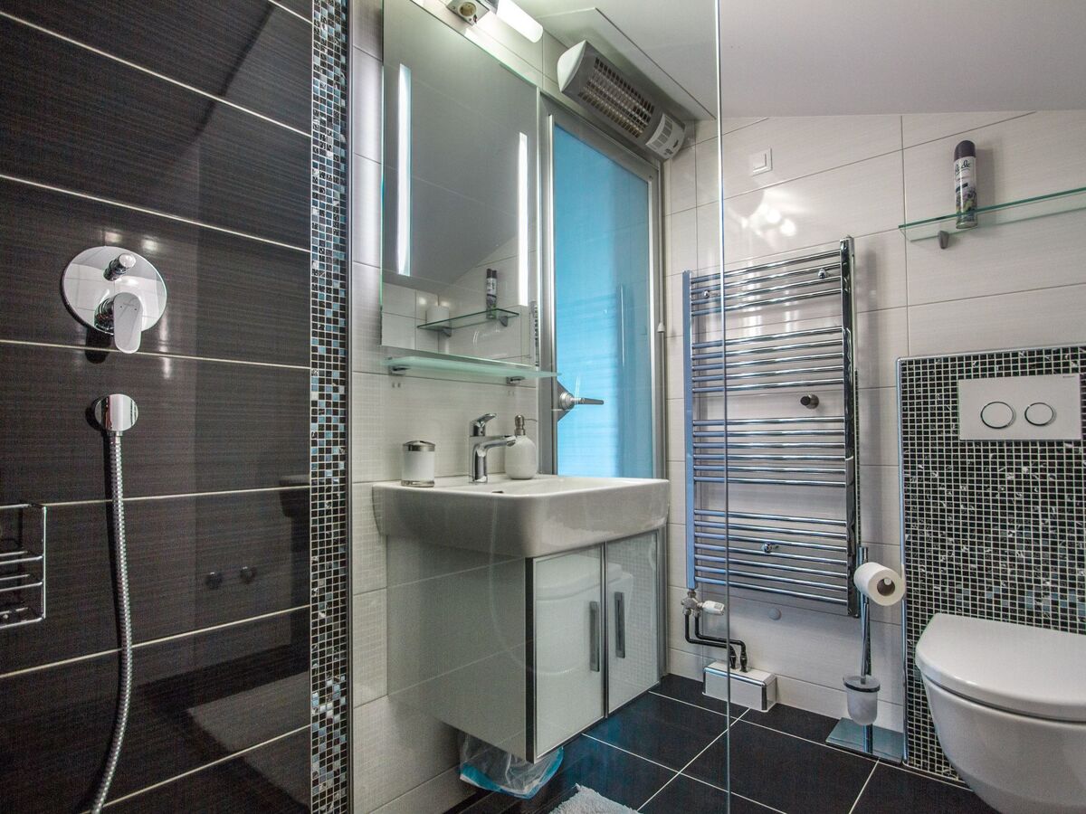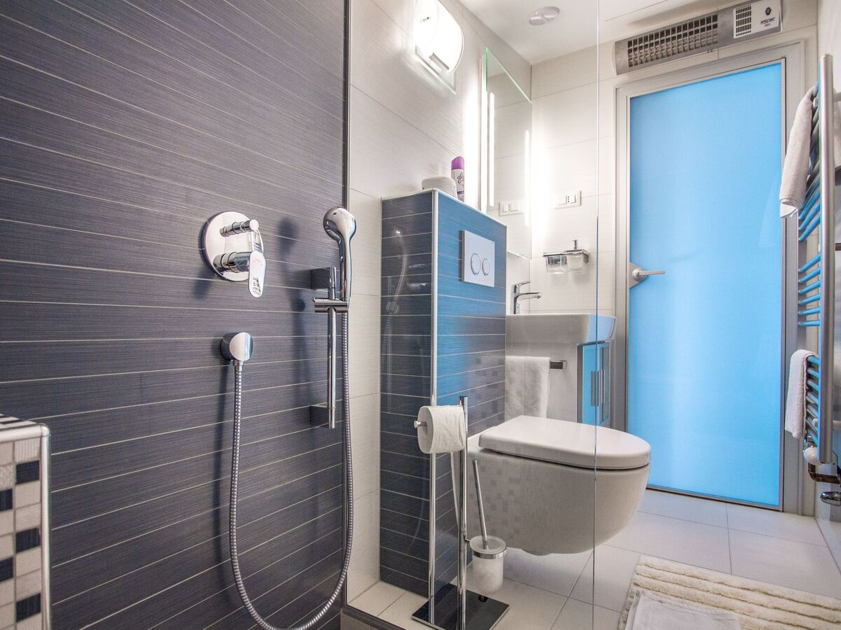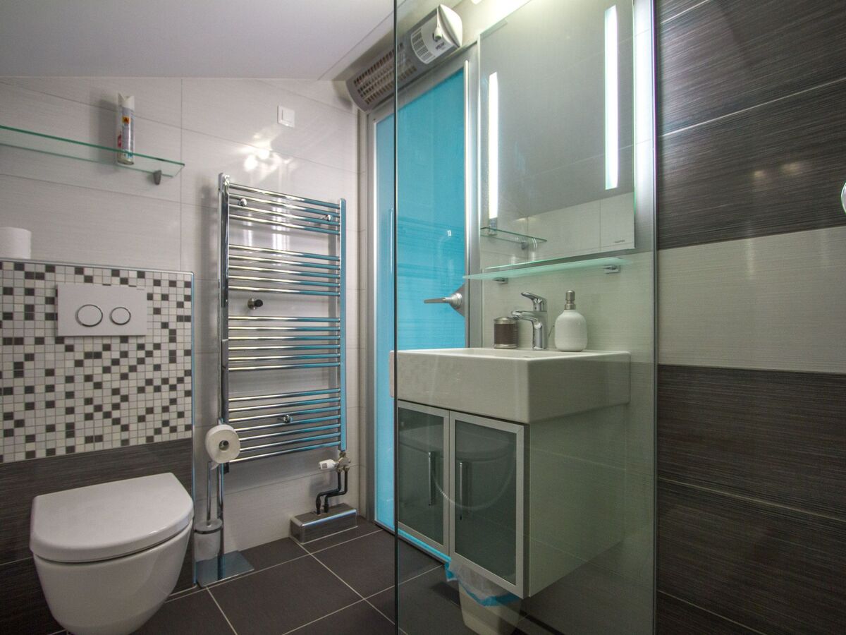 All of them have wide washbasins with a cupboard underneath, a wall mirror and a toilet.