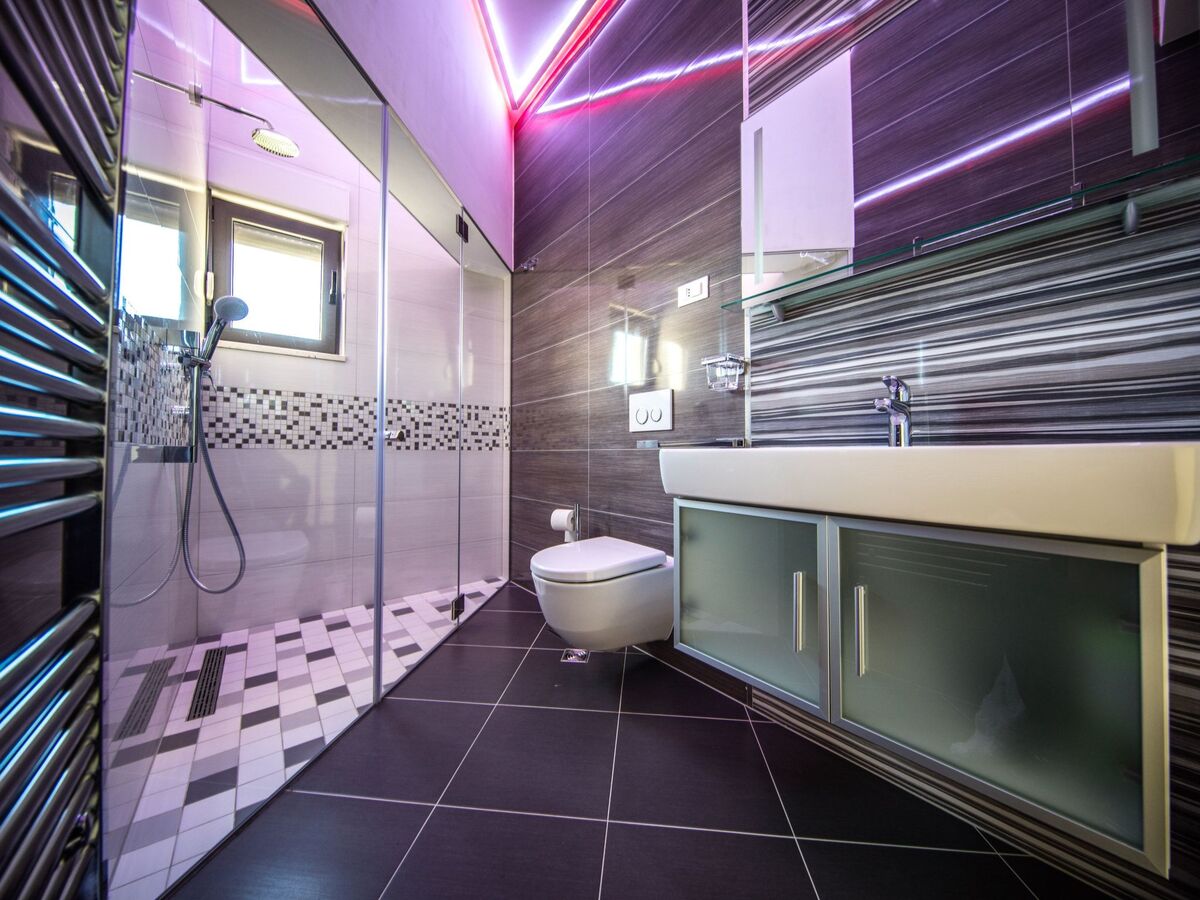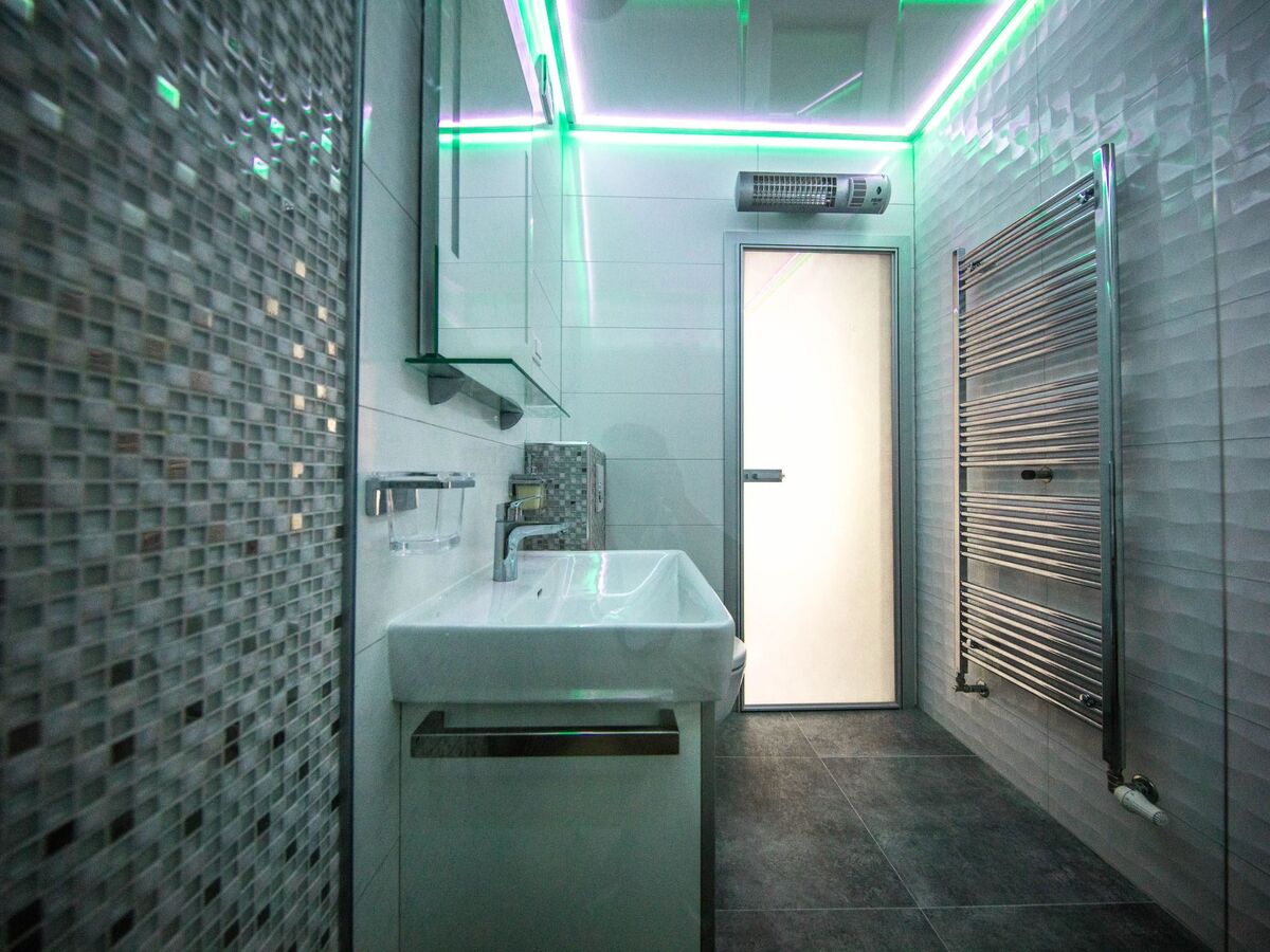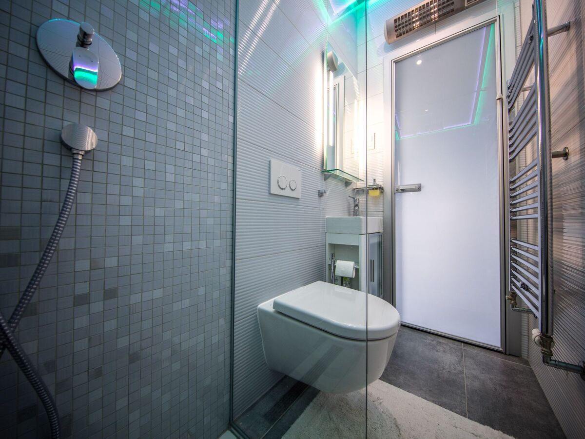 All of them have wide washbasins with a cupboard underneath, a wall mirror and a toilet.