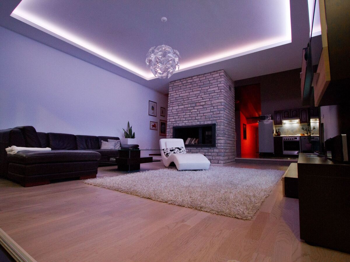 The modern built-in kitchen next to it has only the latest appliances: dishwasher, four-zone hob with a cooker hood, oven, microwave, fridge with freezer compartment, kettle, toaster, coffee machine.