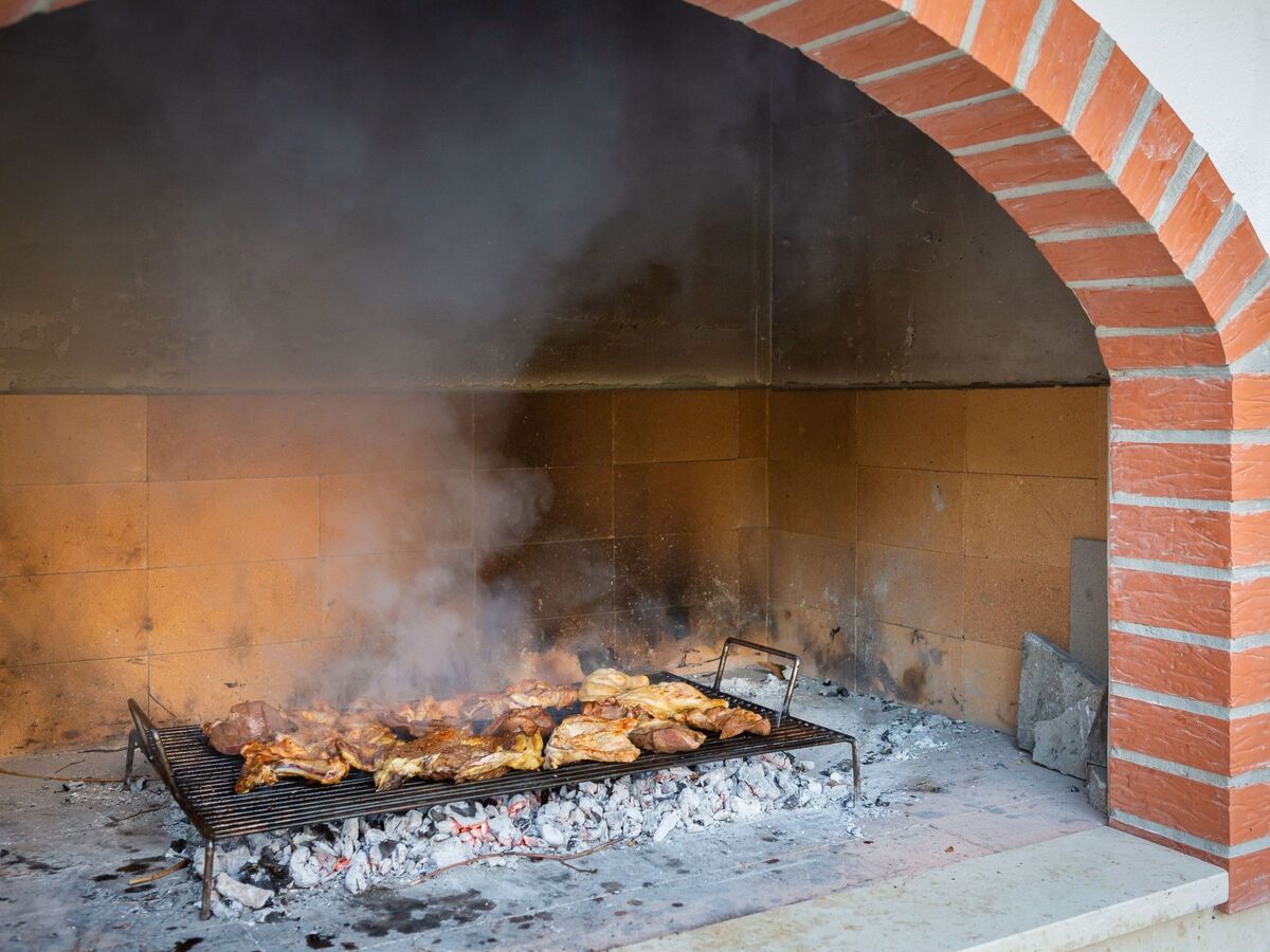 The spacious terrace area with pool is equipped with sun loungers, a sunbed, a barbecue, and a large table with chairs.