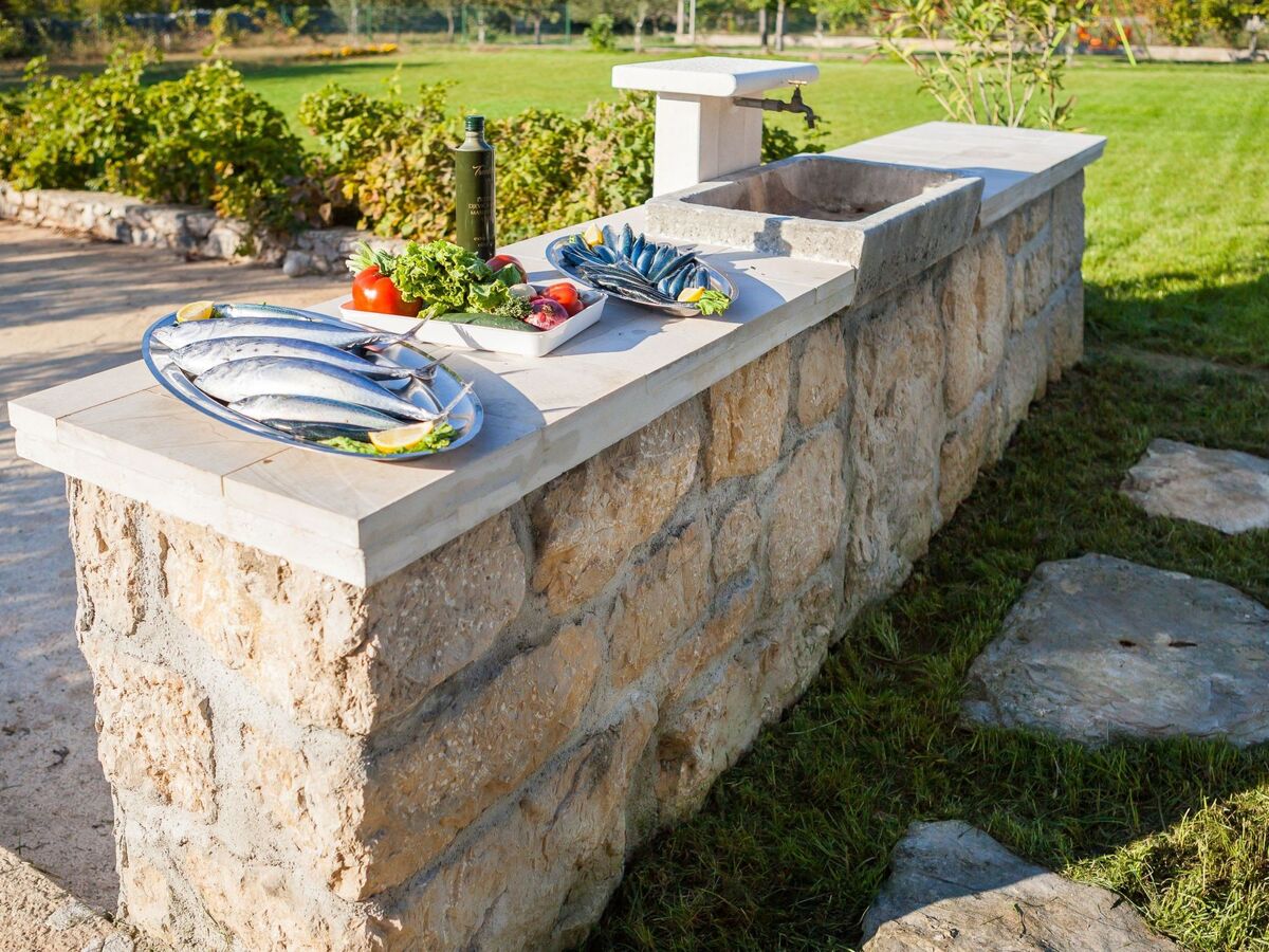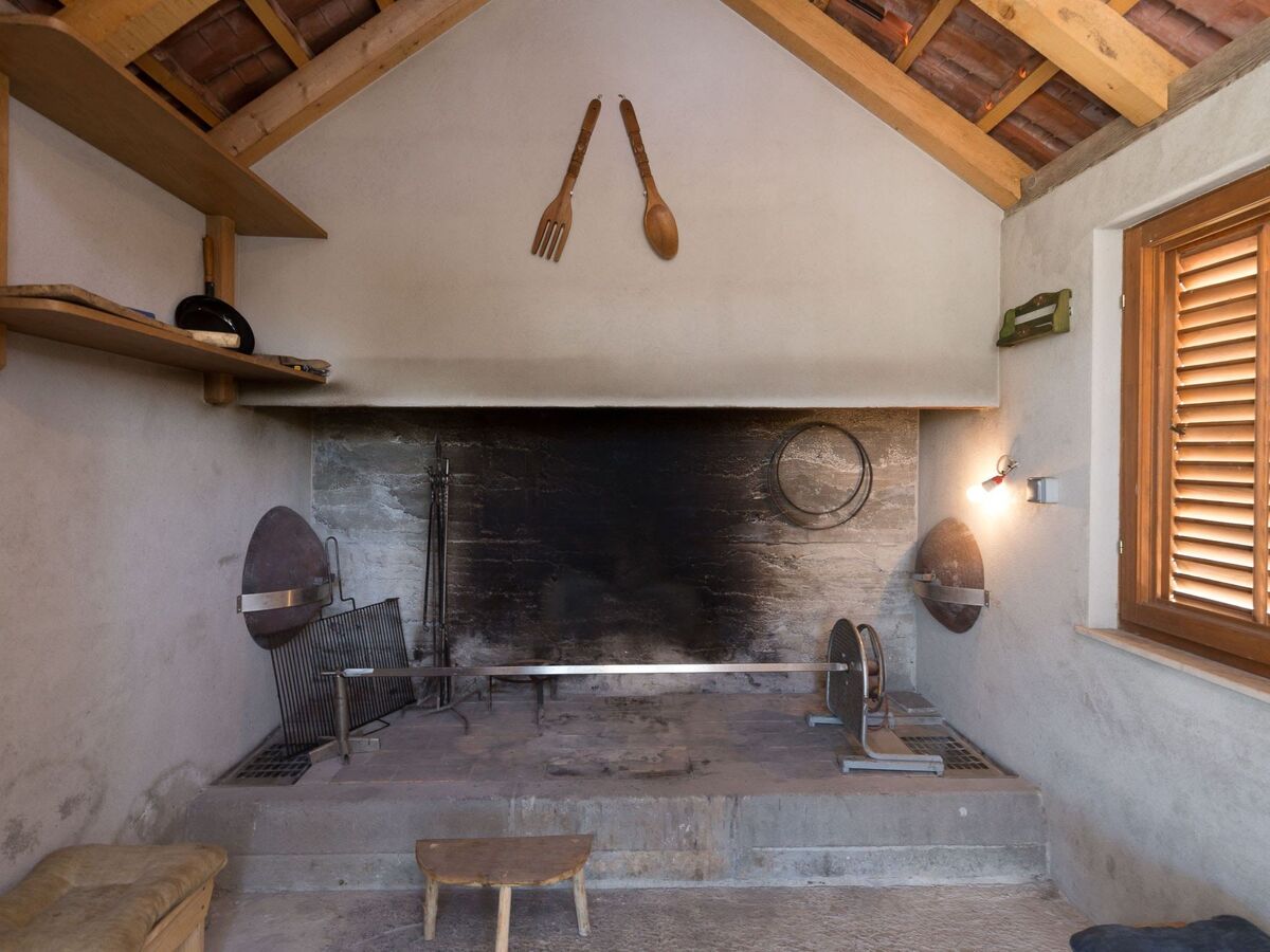 A traditional stone grill next to it invites you to enjoy leisurely meals under an open sky.