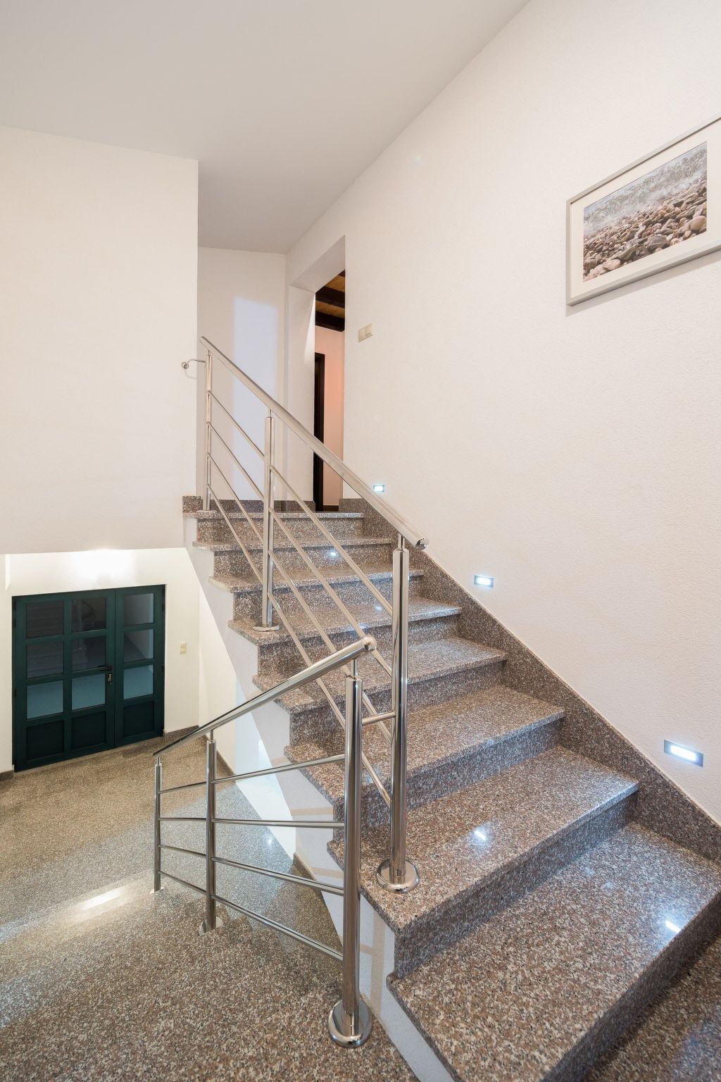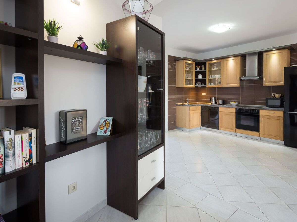 The built-in kitchen next to it, as expected, is equipped with only the latest appliances, including a dishwasher, a ceramic hob with an elegant stainless steel cooker hood, an oven, a fridge with a freezer compartment, a microwave and a coffee machine.