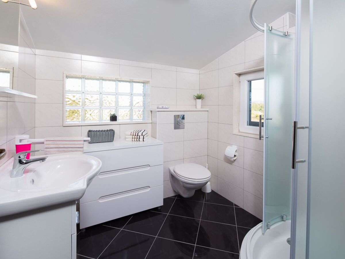 All three have a highly modern and spacious shower cubicle, a wide washbasin with a cupboard underneath and a wall mirror, a hairdryer and a toilet.