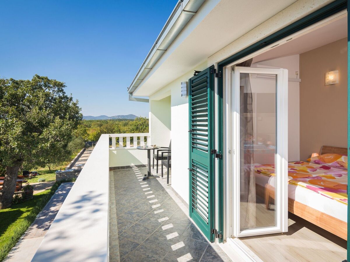 One of the bedrooms on the upper floor opens directly onto a big sunny balcony with an extensive view over the green landscape.