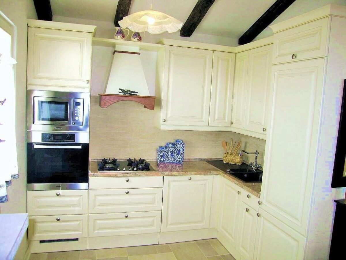 The floor is laid with Italian tiles and there are wooden beams on the ceiling.