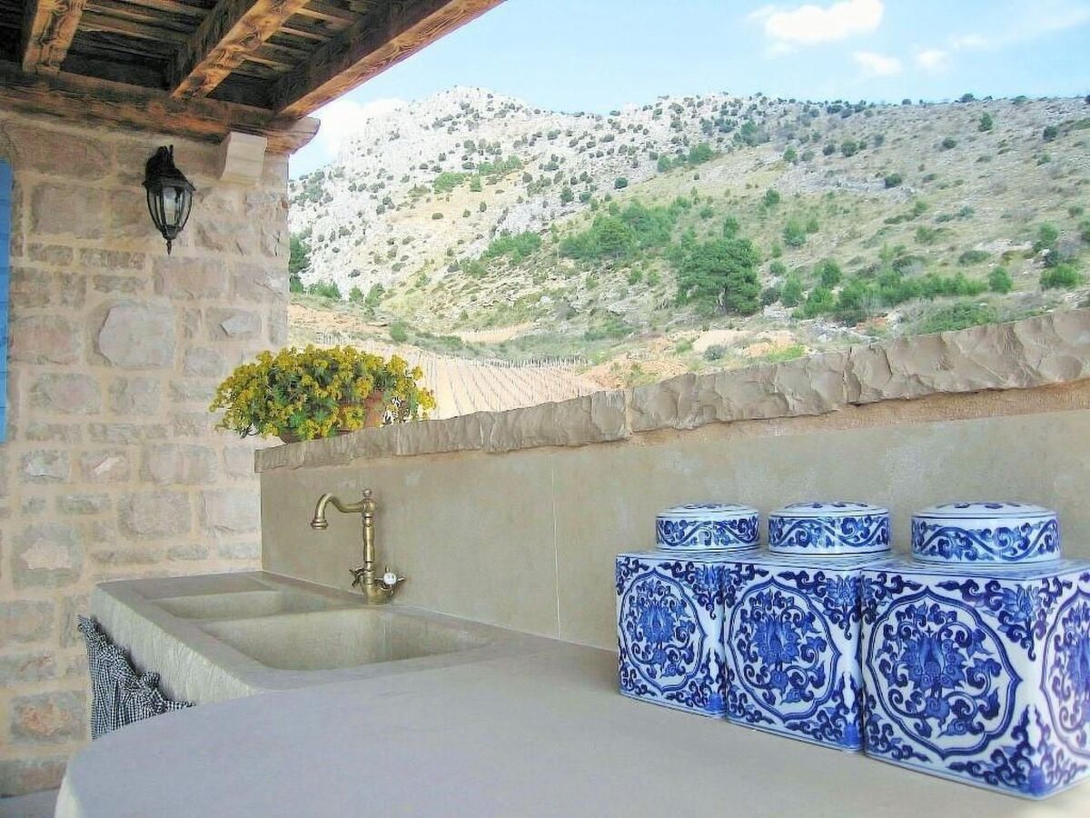 The house has a terrace and an outdoor kitchen, which has a natural stone sink and counter.
