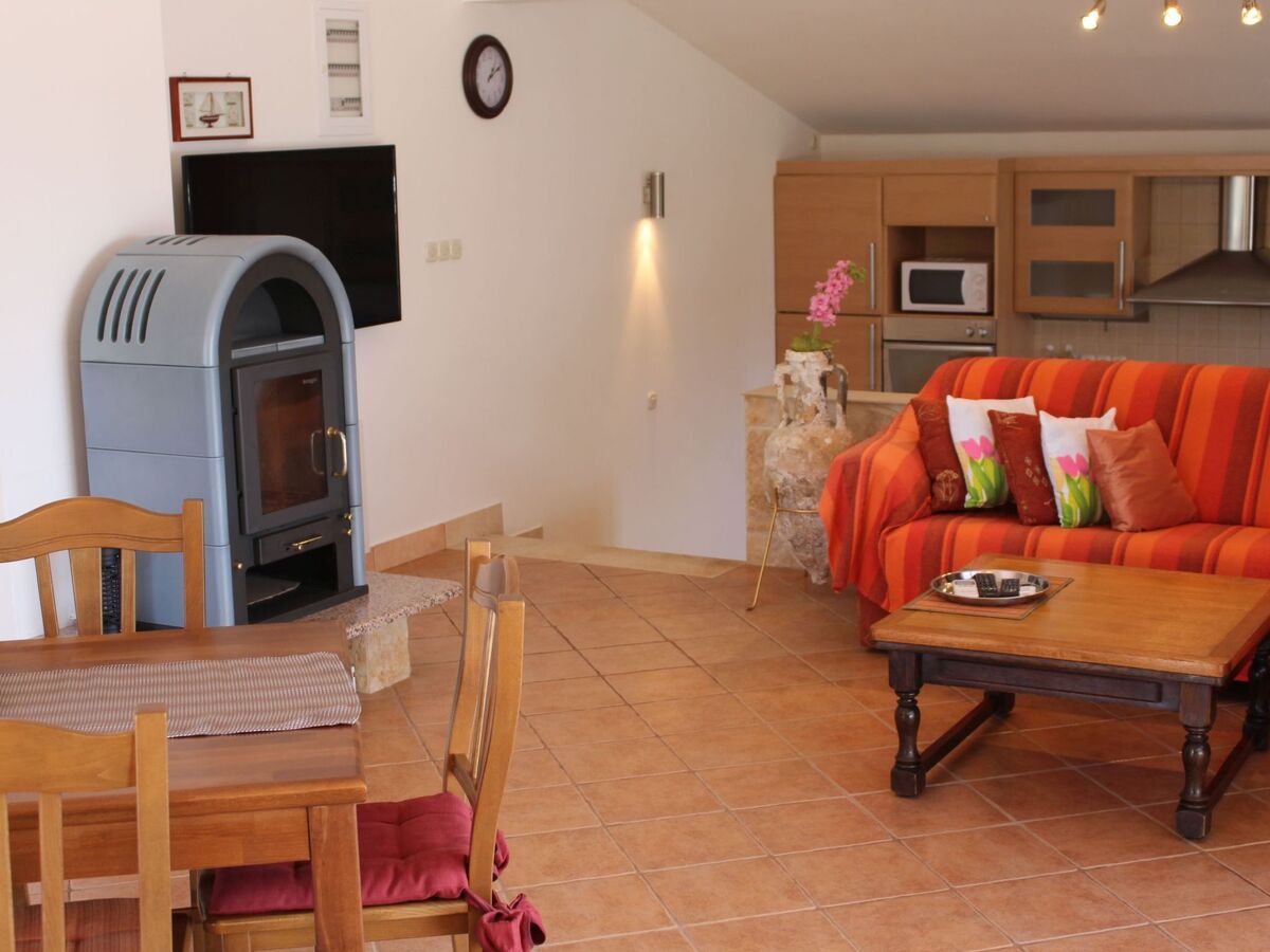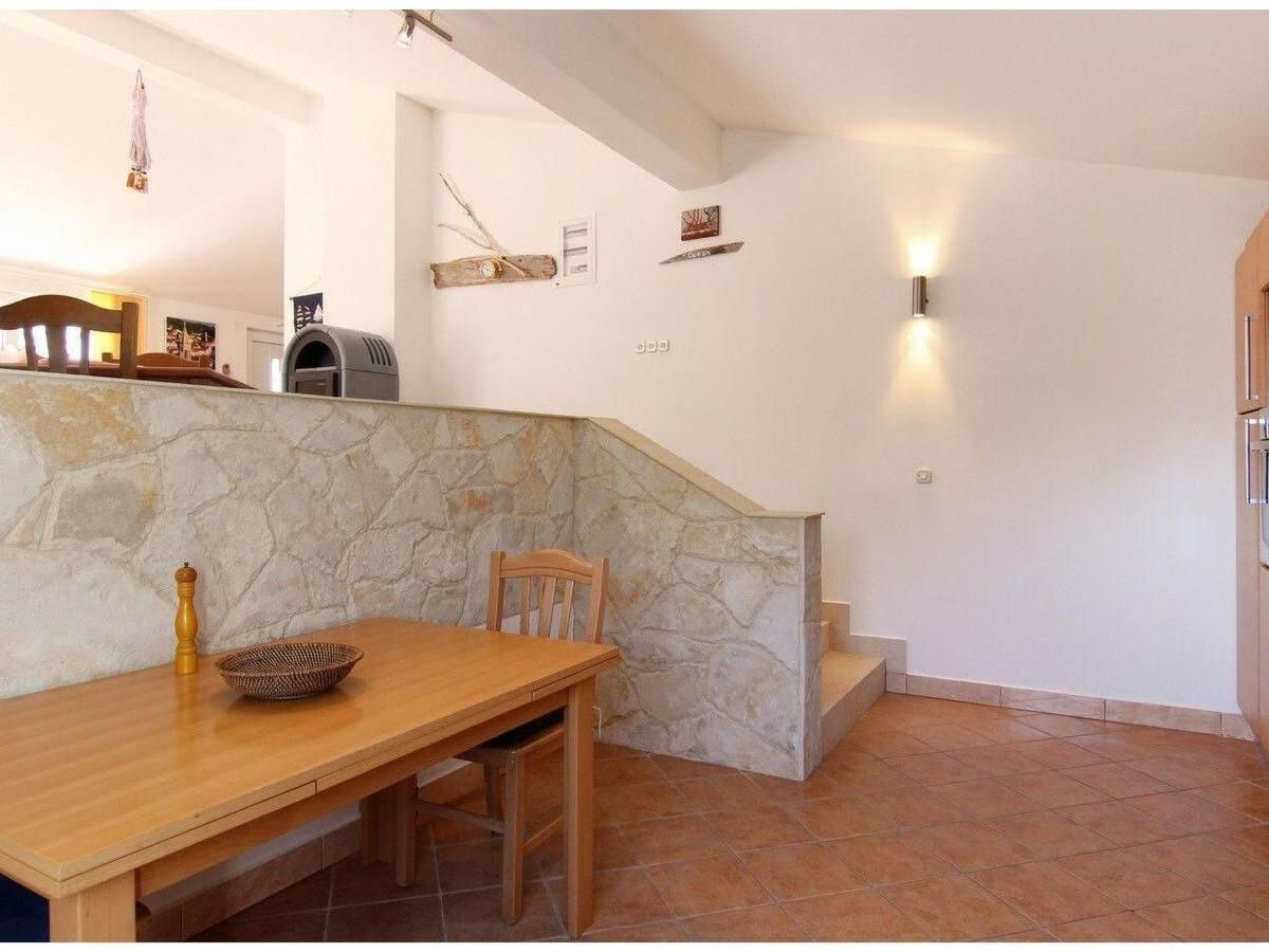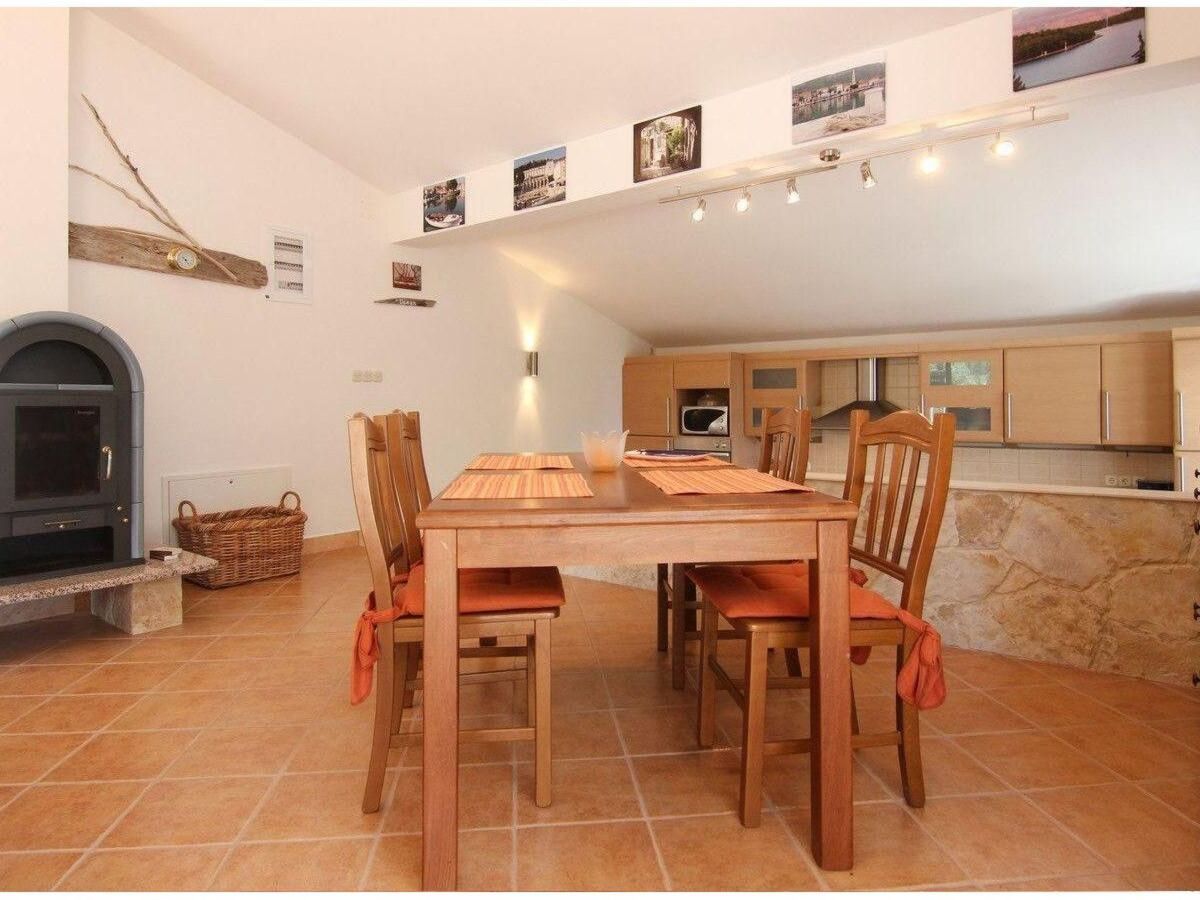 A couple of steps lead to the dining space in the living room, with a wooden table and chairs and a heating stove.
