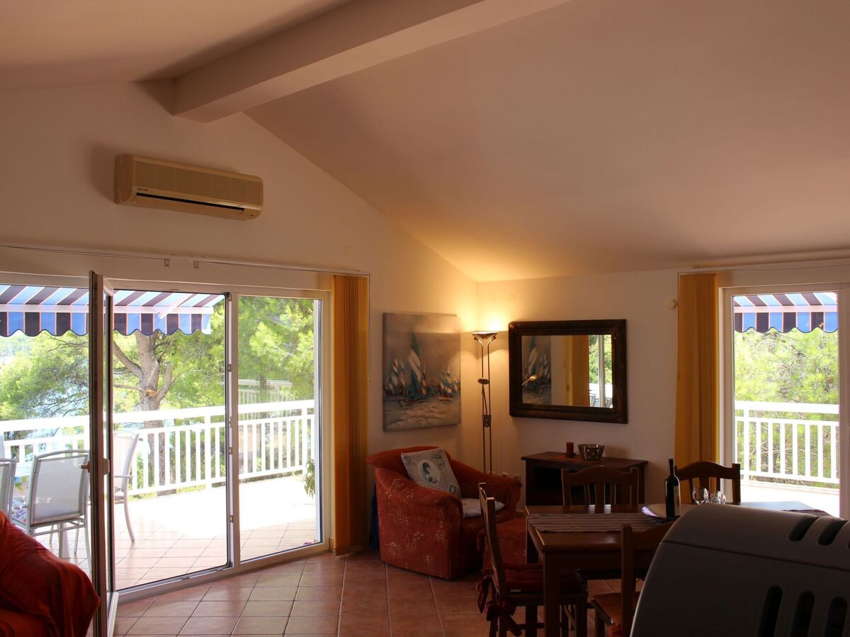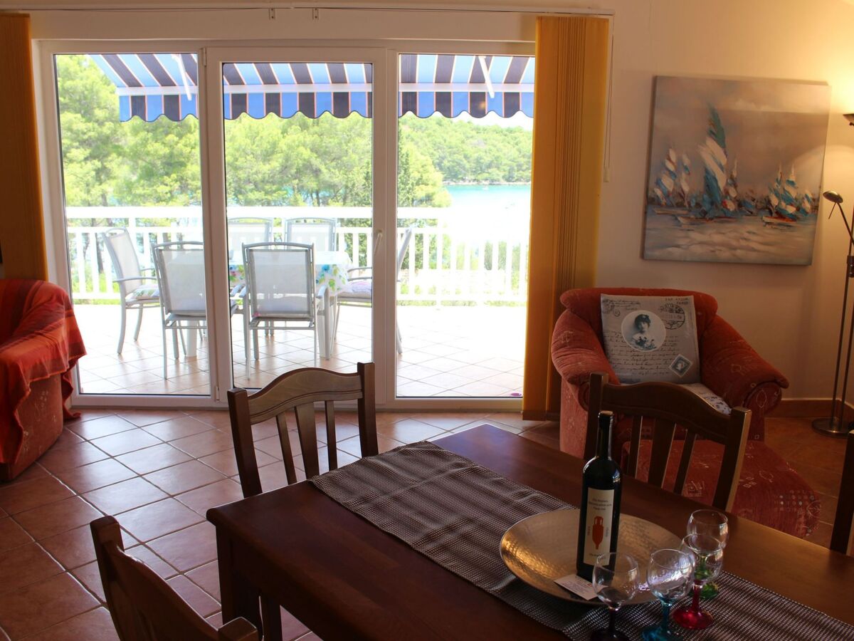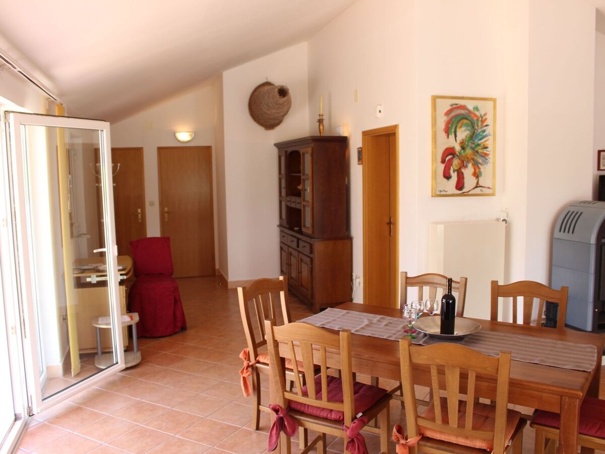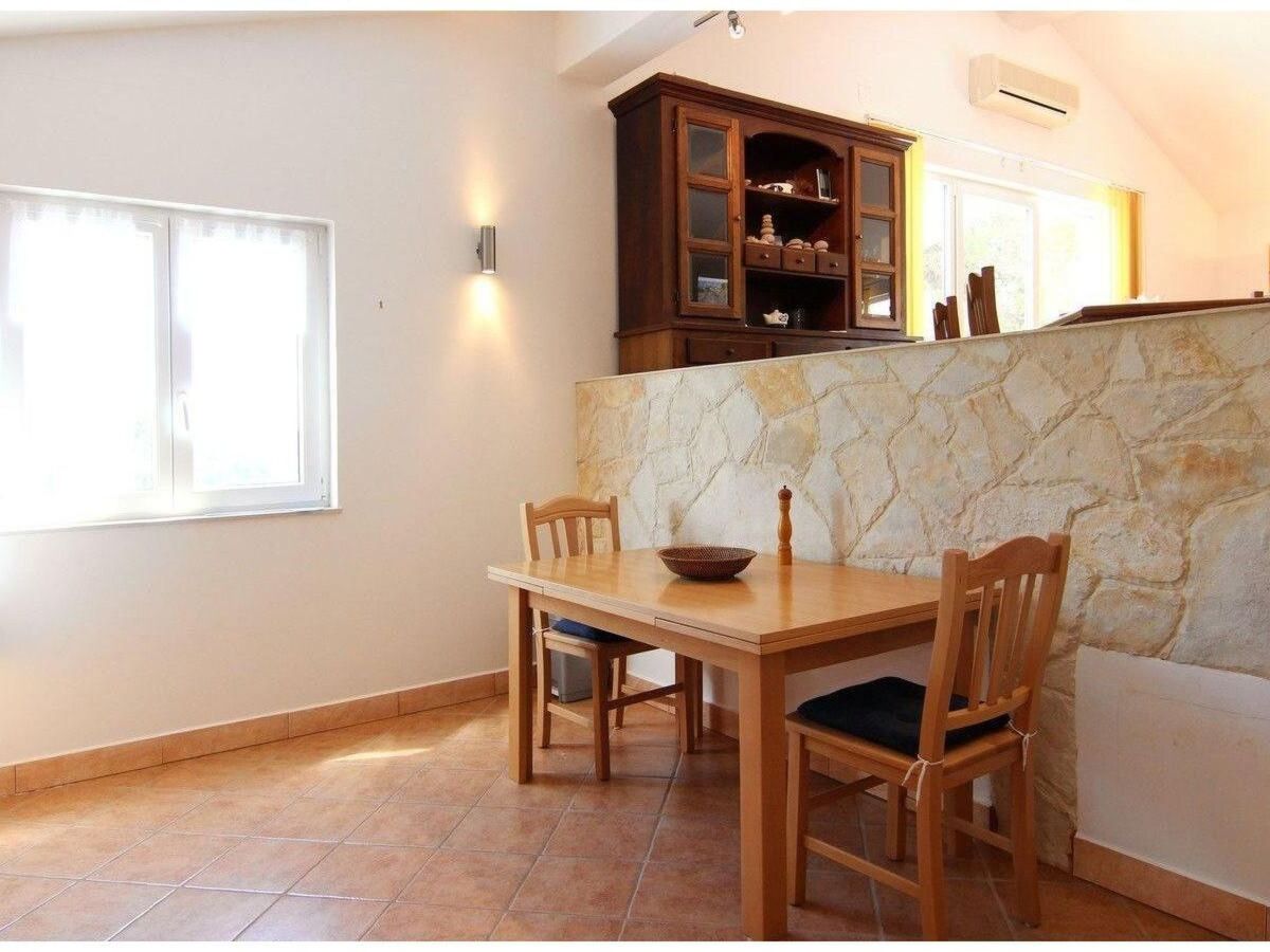 A couple of steps lead to the dining space in the living room, with a wooden table and chairs and a heating stove.