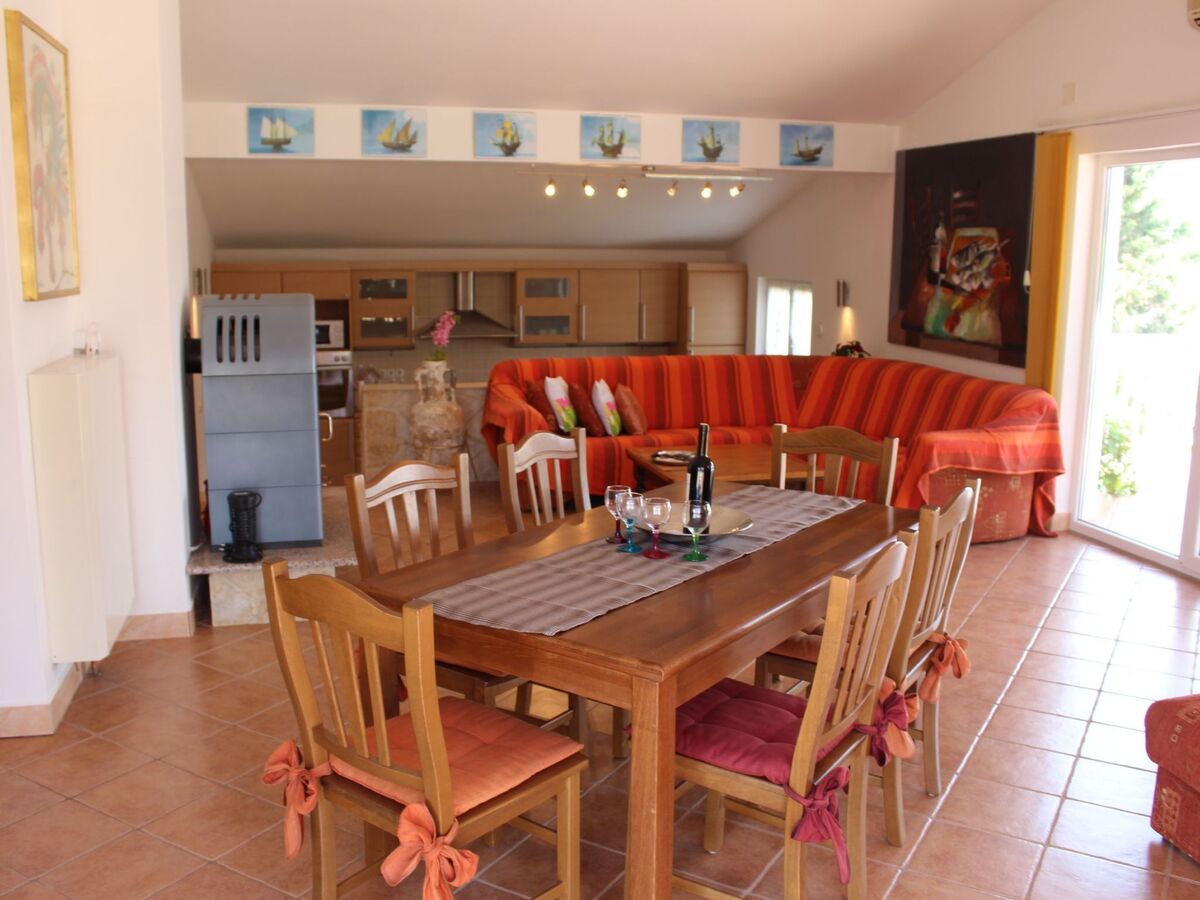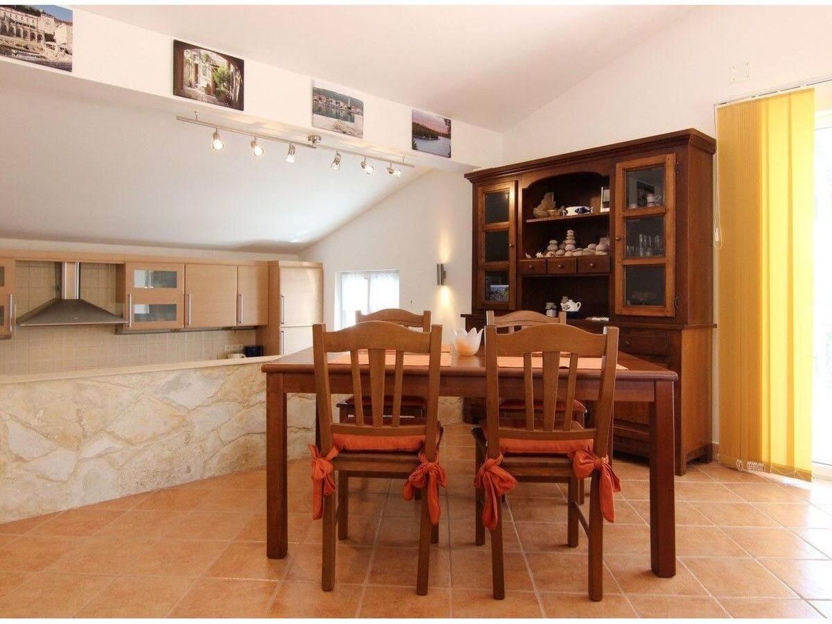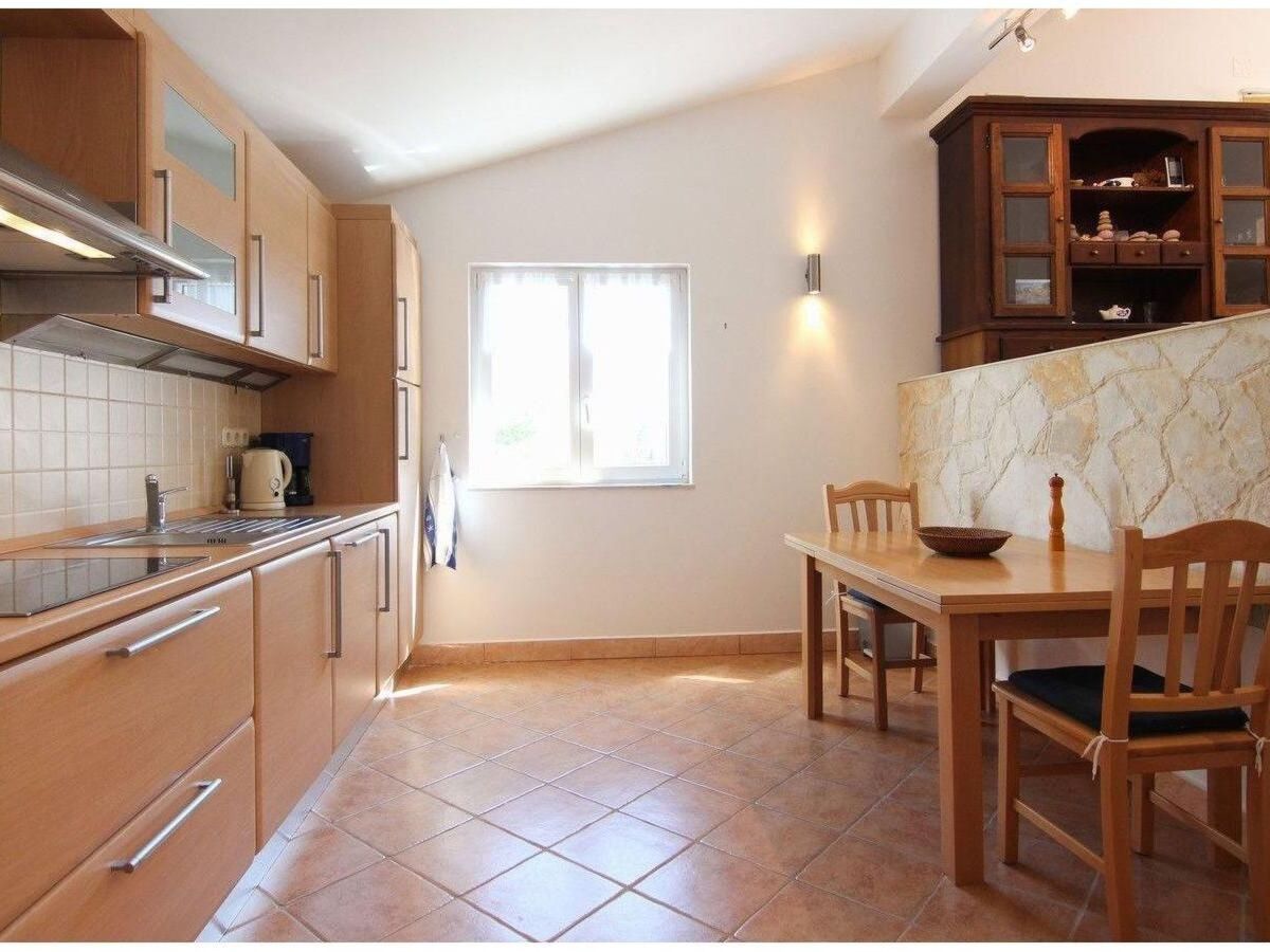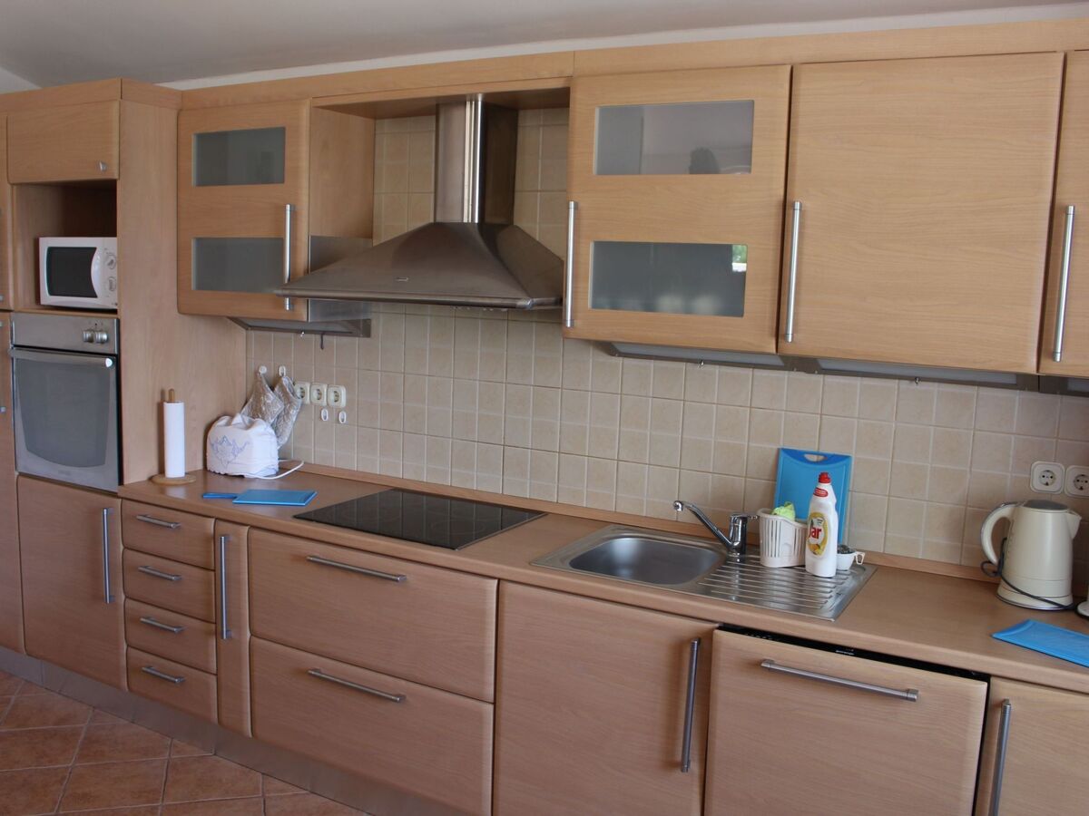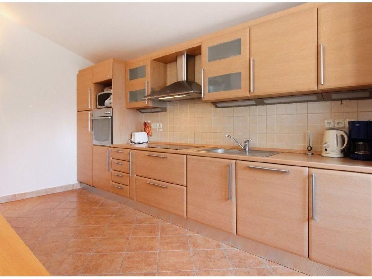 The generous, open kitchen is equipped with a fridge with a freezer compartment, a ceramic hob, an oven, dishwasher, microwave, toaster, kettle and coffee machine, as well as a big, extendable dining table with chairs.