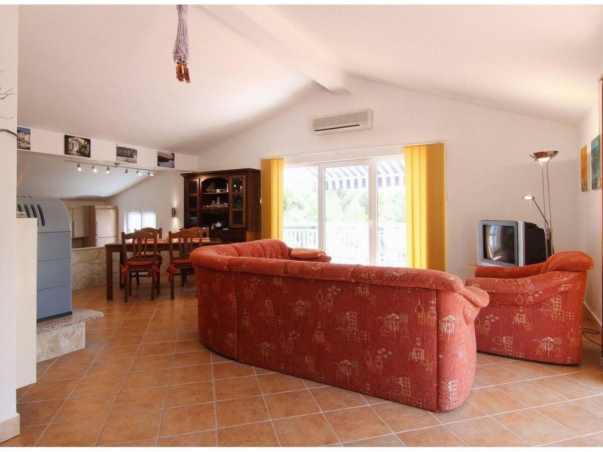 The living room opens onto the 80m² terrace with a table and chairs, shaded by an awning, so you can enjoy meals outdoors.