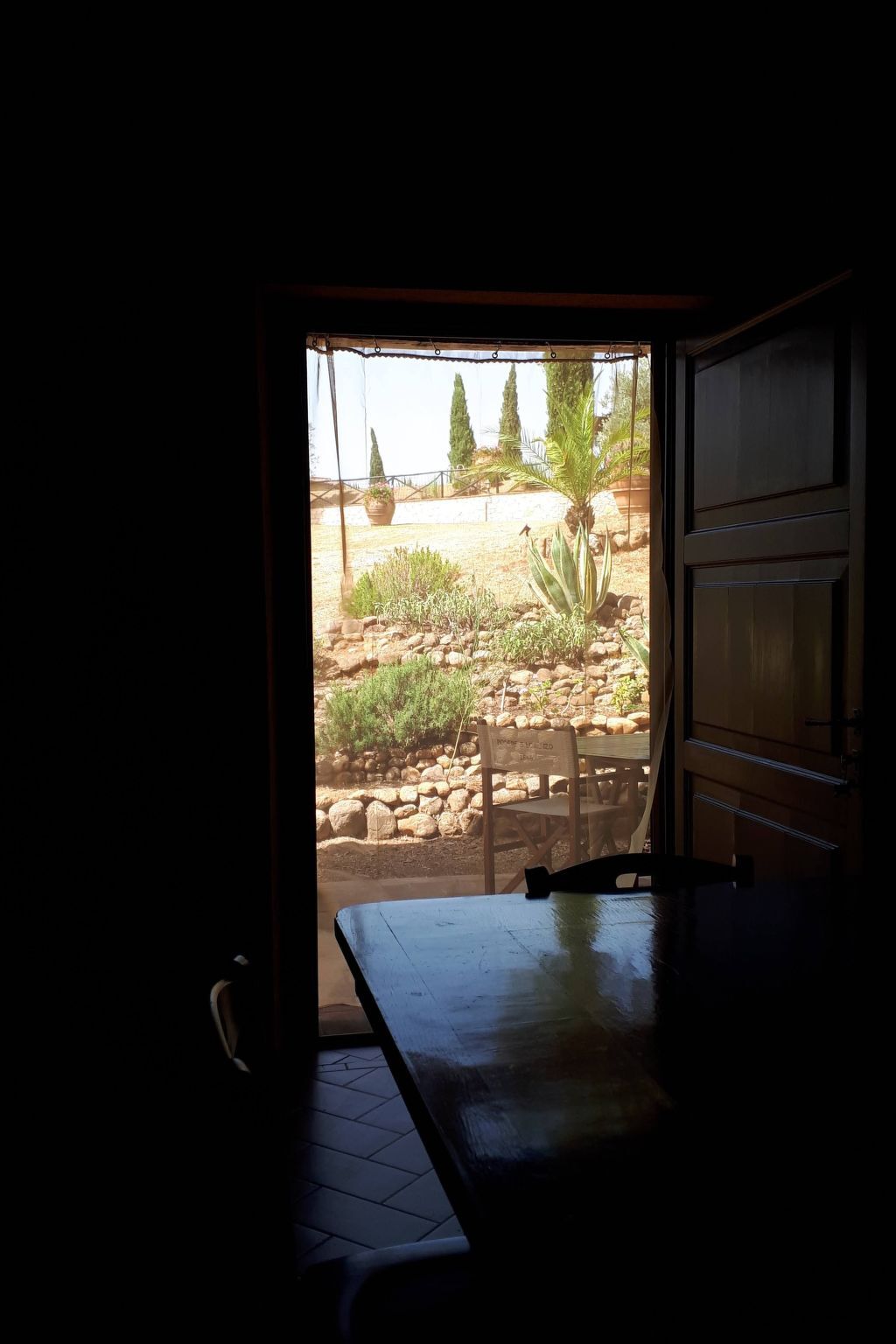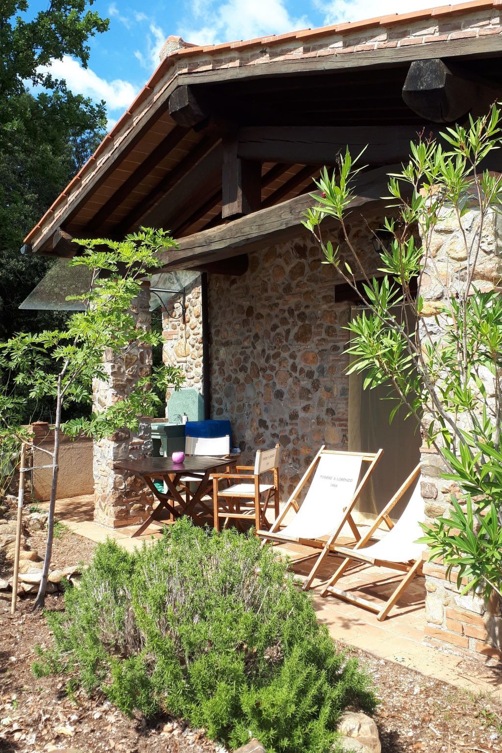 Outside there is a private covered patio, furnished with wooden furniture (table, chairs and deckchairs), grit garden sink.