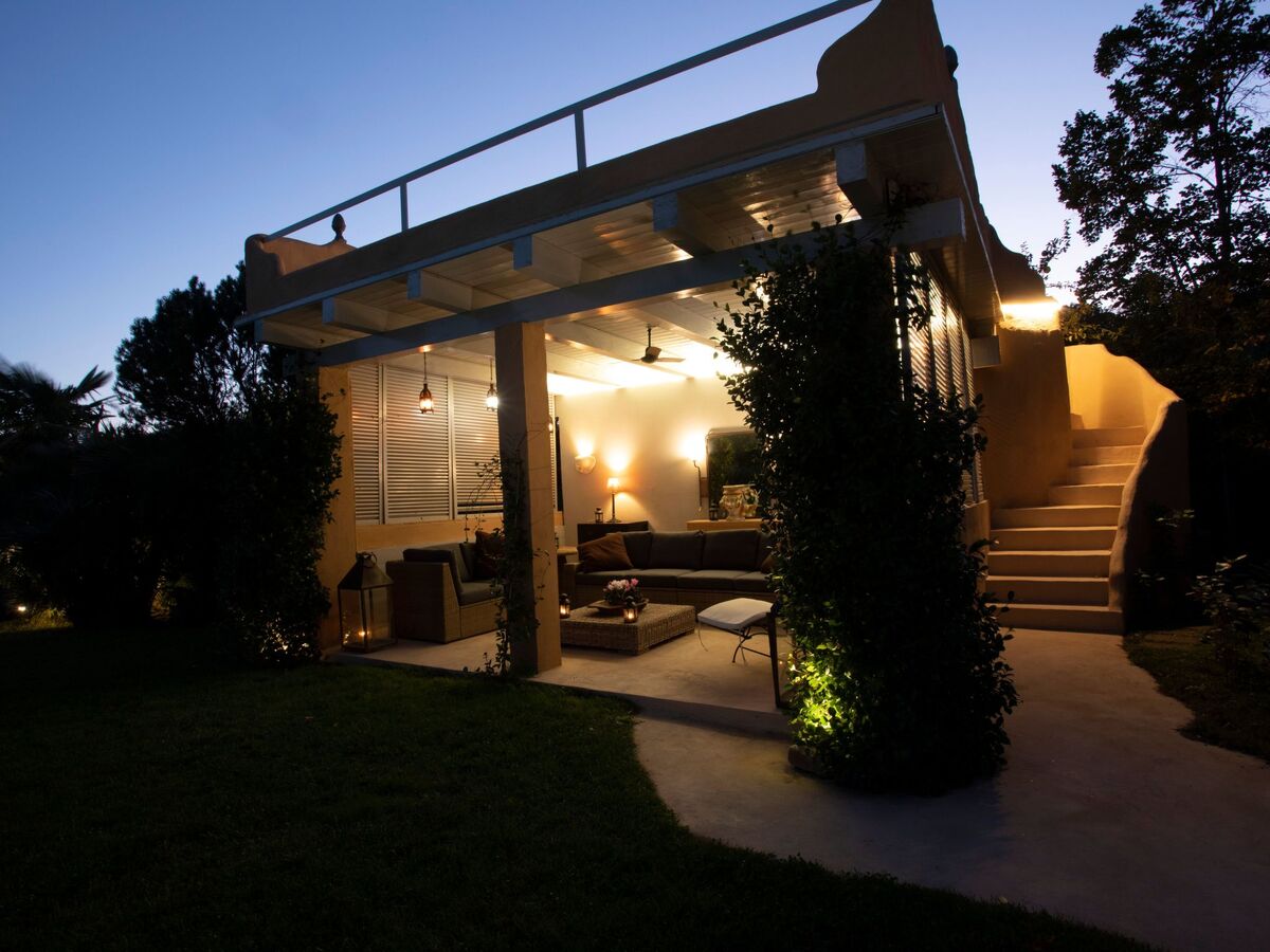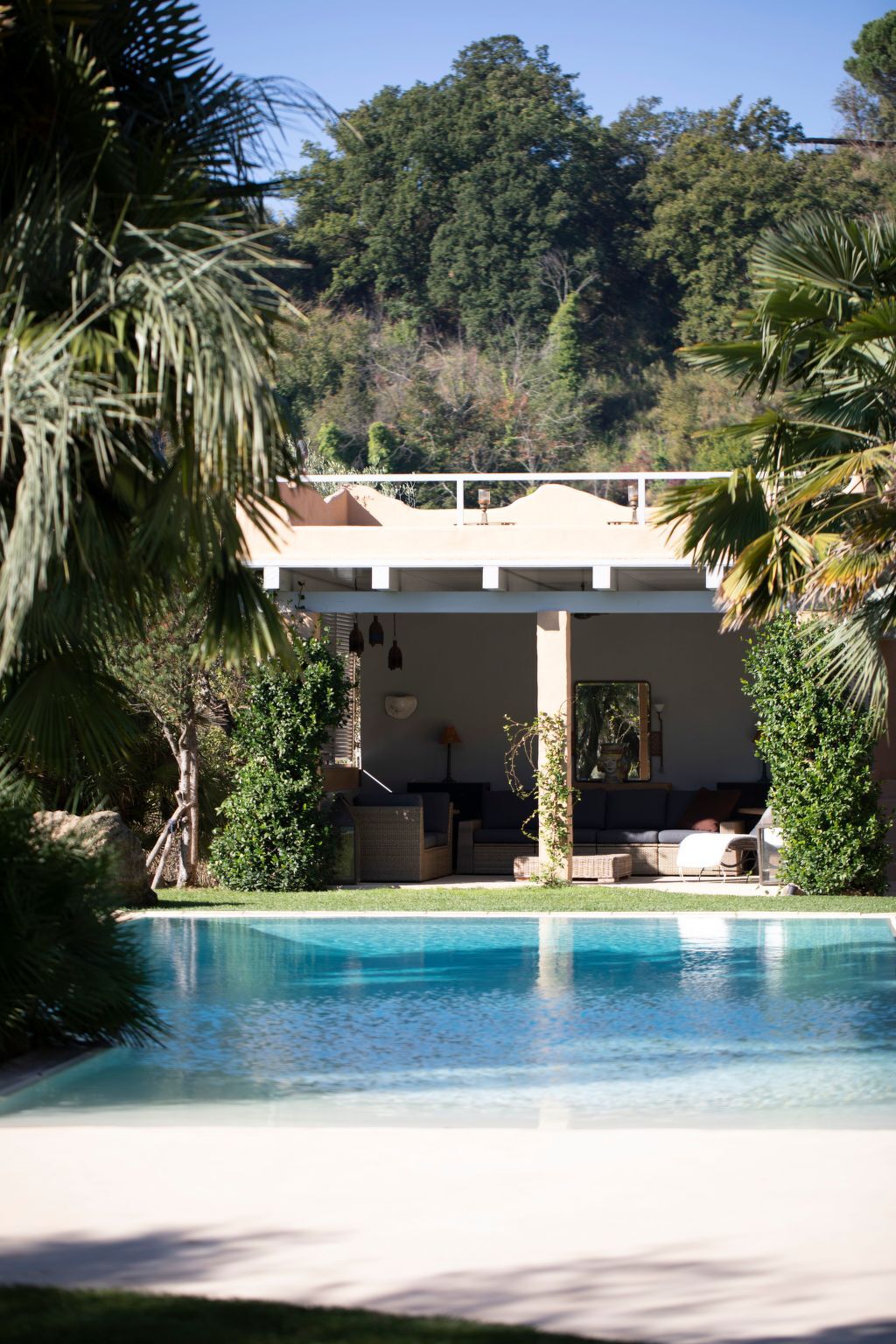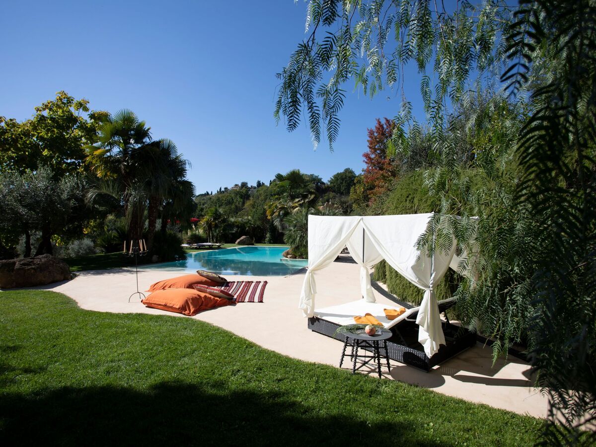 A few steps away from the pool there is also a romantic pergola furnished with sofas, a coffee table and a ceiling fan.