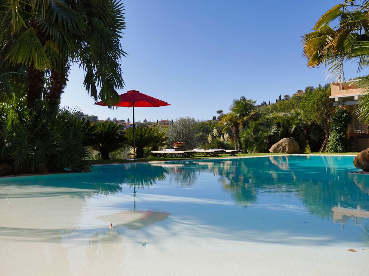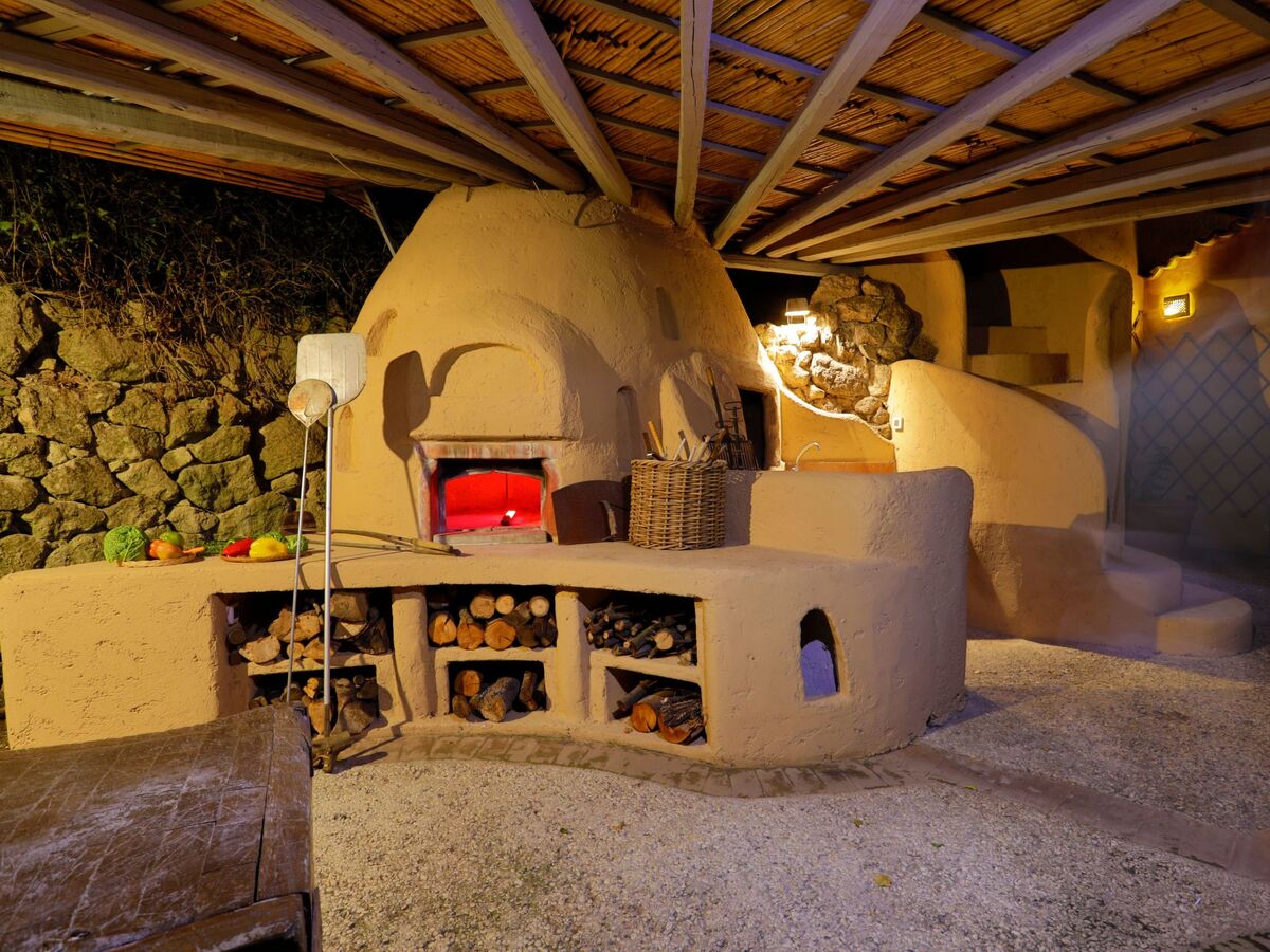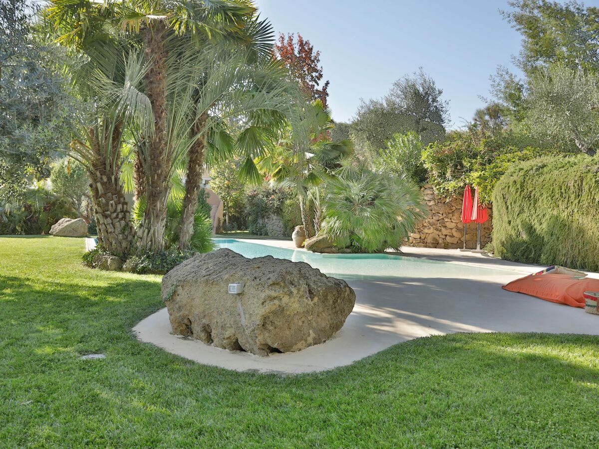 A few steps away from the pool there is also a romantic pergola furnished with sofas, a coffee table and a ceiling fan.
