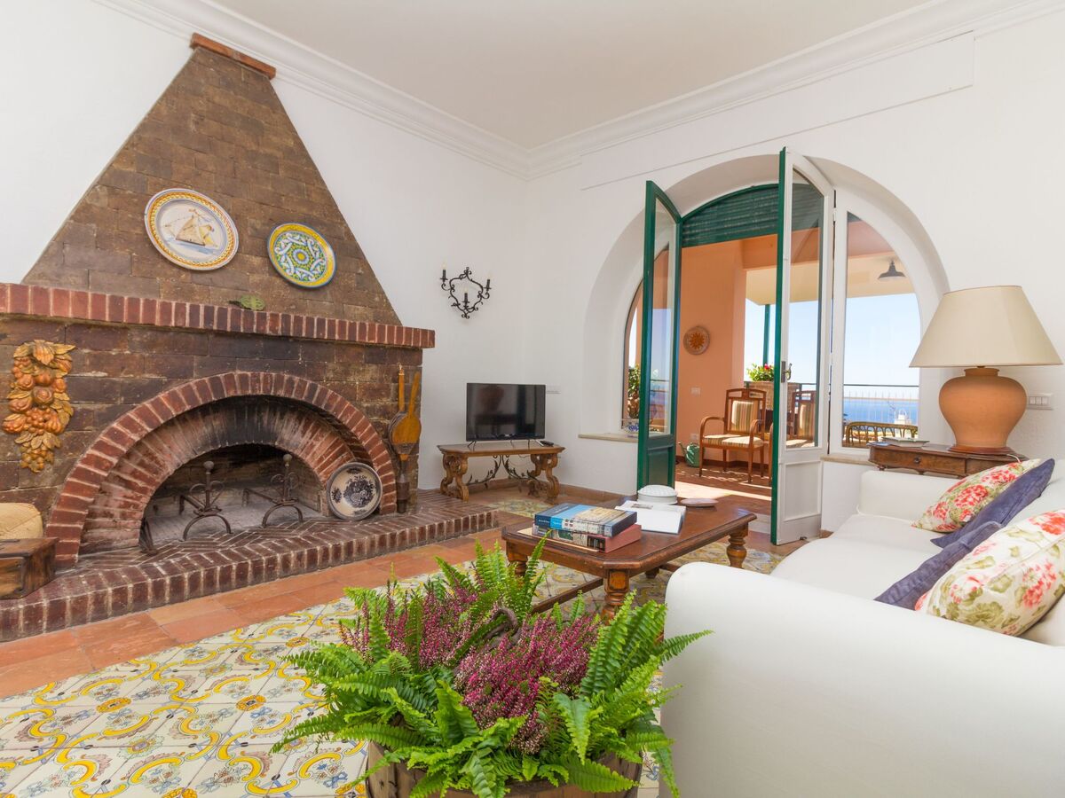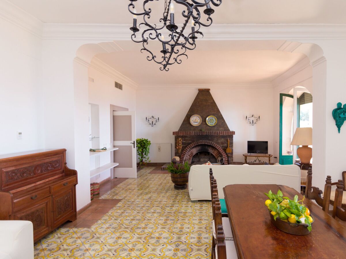 The living area opens onto the terrace, furnished with comfortable sofas, TV and a grey tuff fireplace.