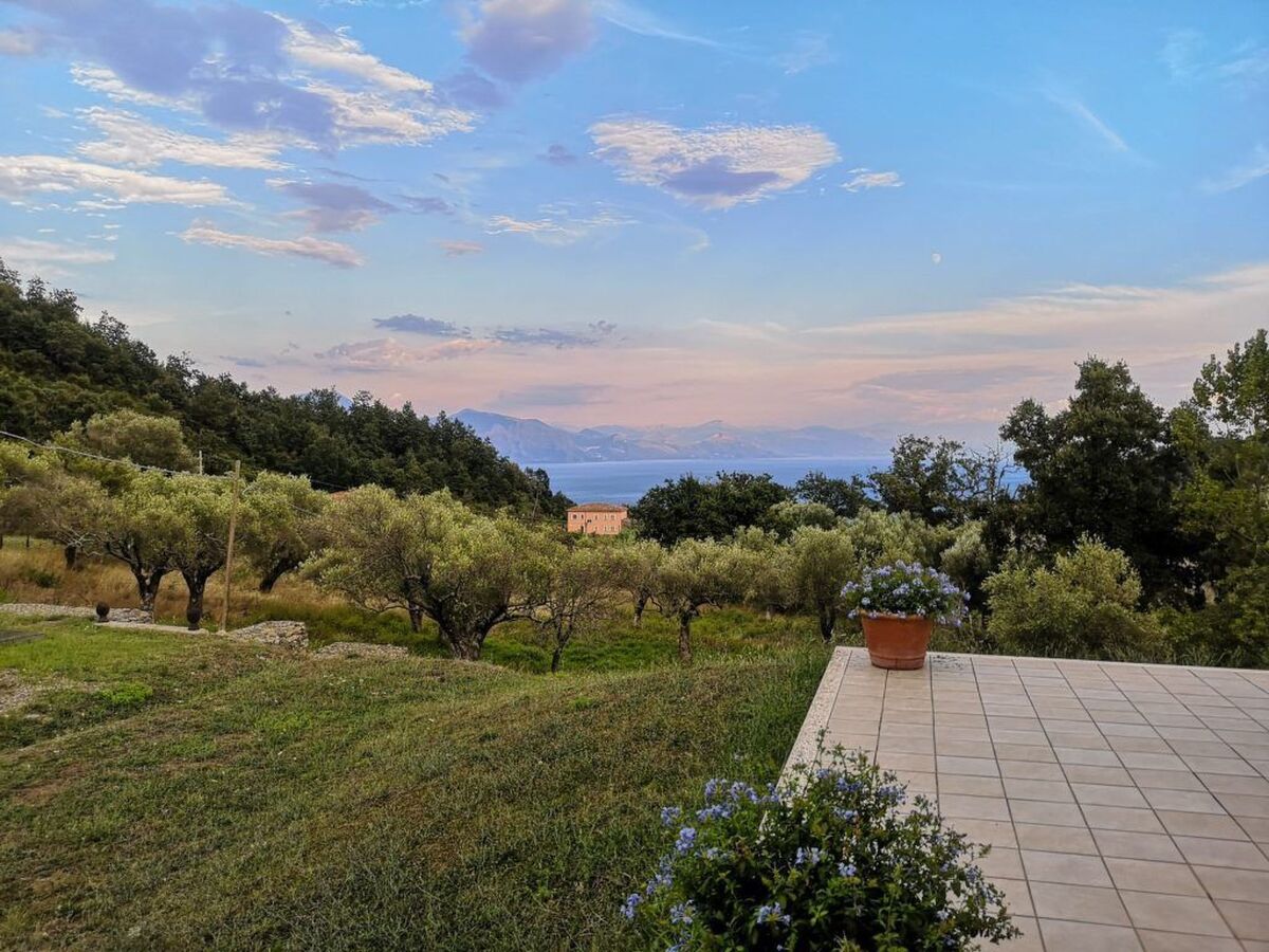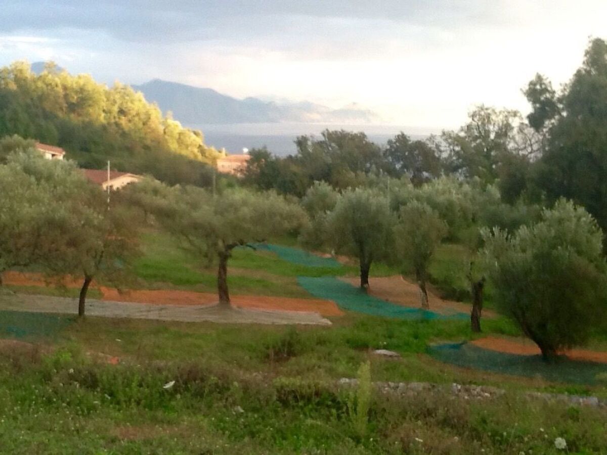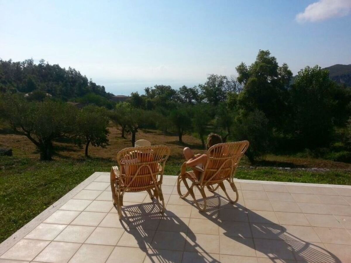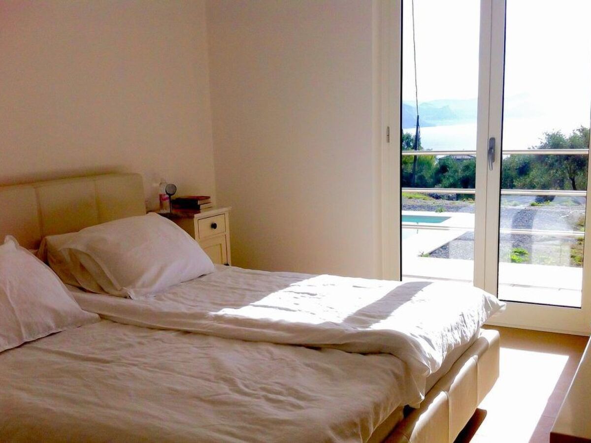 Sliding doors to terrace with stunning views of olive trees and the sea.