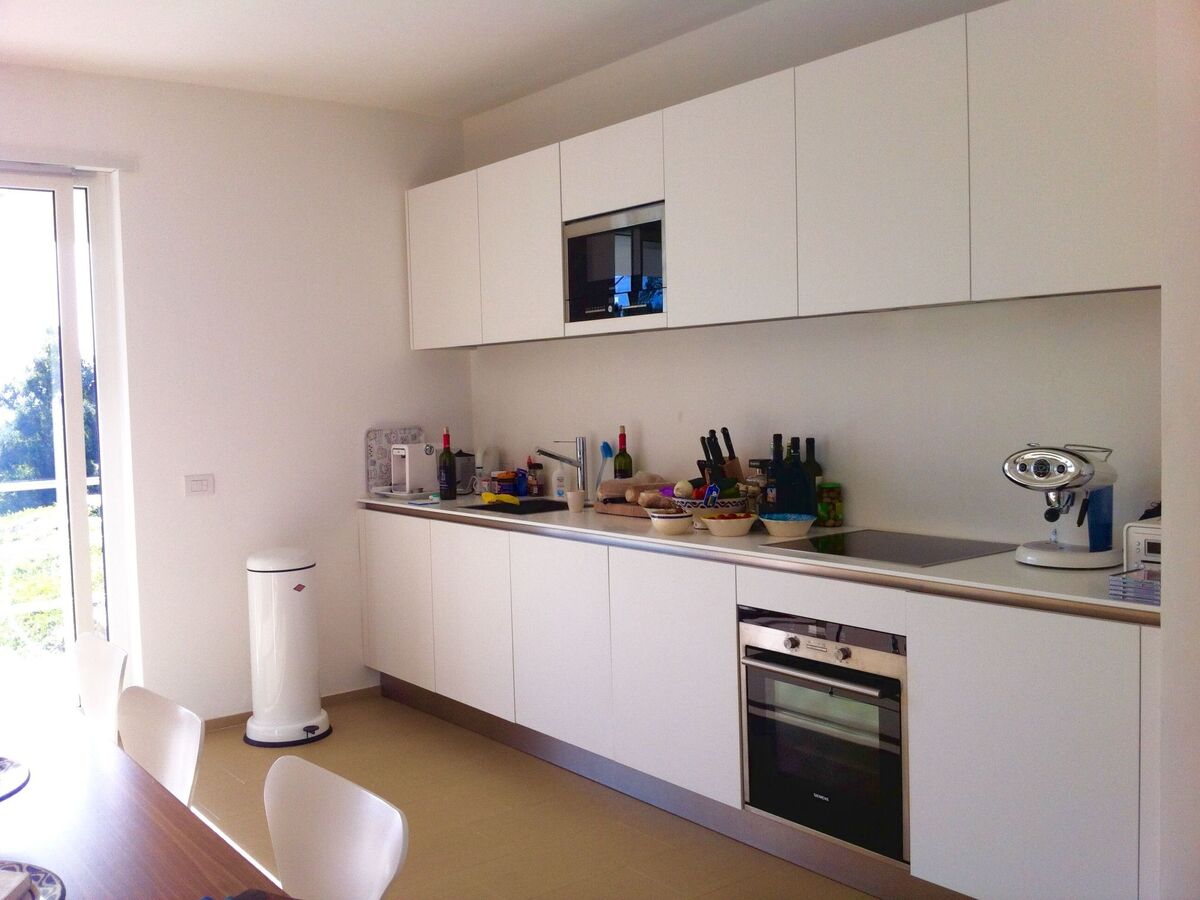 A modern Italian Boffi kitchen with 4 induction hobs, oven and microwave, with large Smeg fridge.