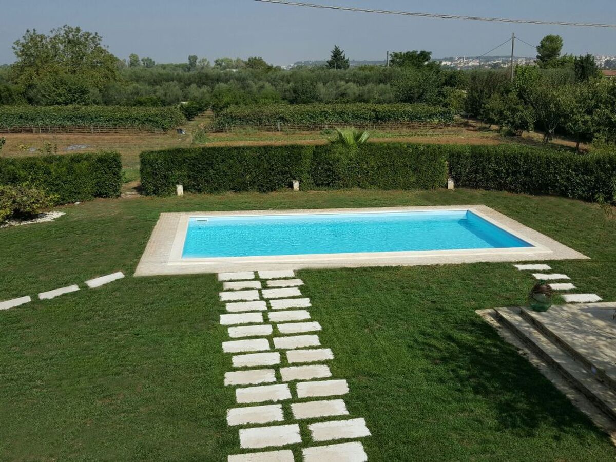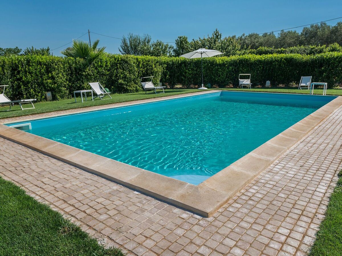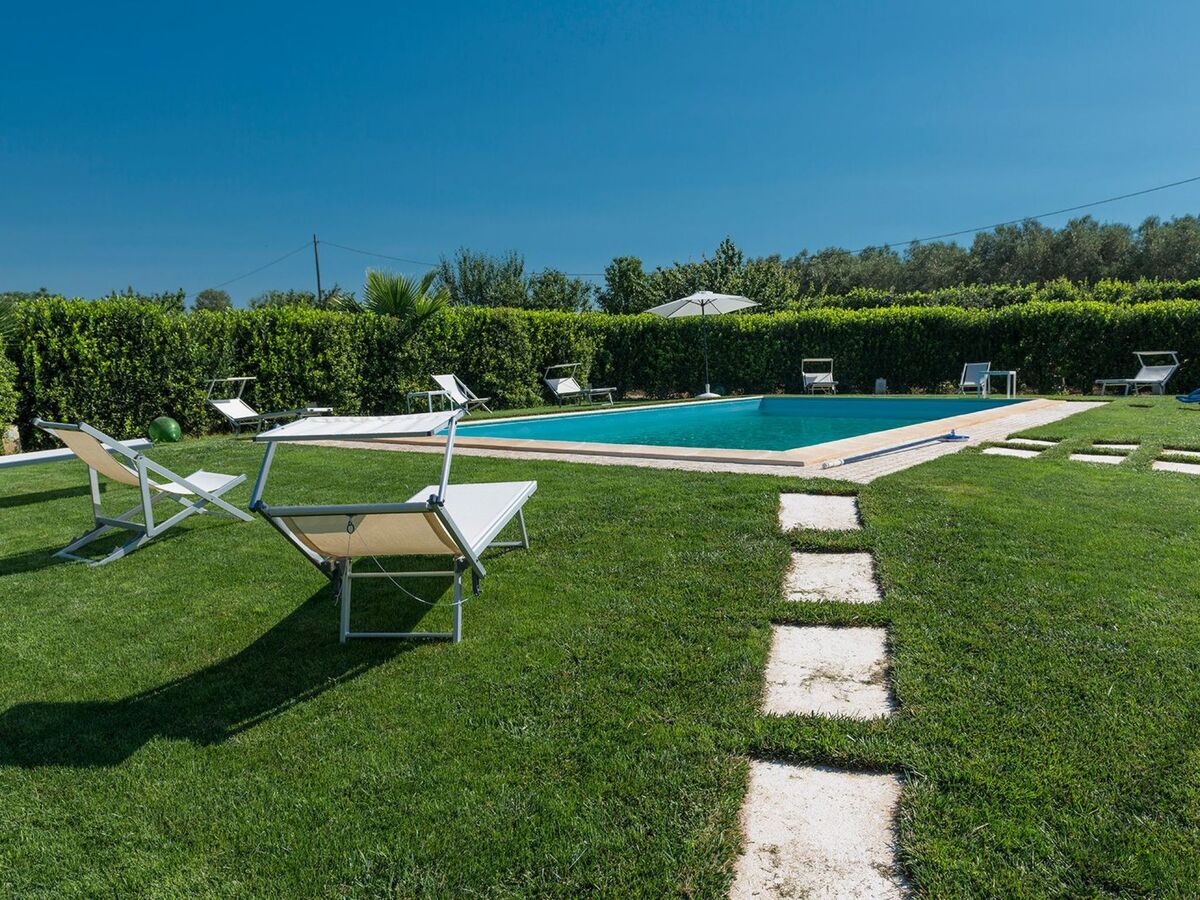 The large swimming pool is bordered by an area of approximately 500 square metres of lawn, a garden with various types of plants typical of the Mediterranean maquis, as well as an area used as an orchard, vineyard (with varieties of negro amaro, montepulciano and black and white malvasia) and olive grove.
