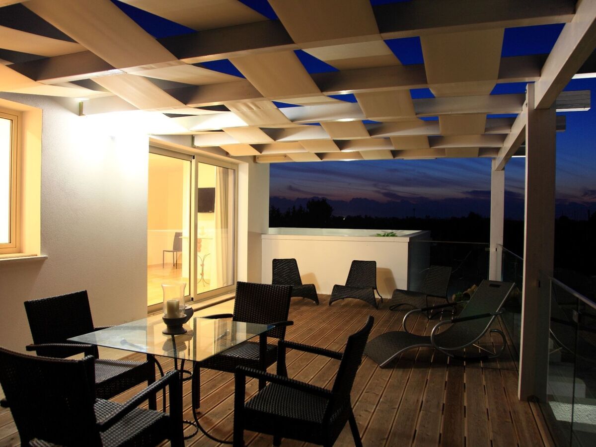 The exterior is characterised by the presence of an outdoor terrace with teak wood flooring and a glass balustrade overlooking the swimming pool.