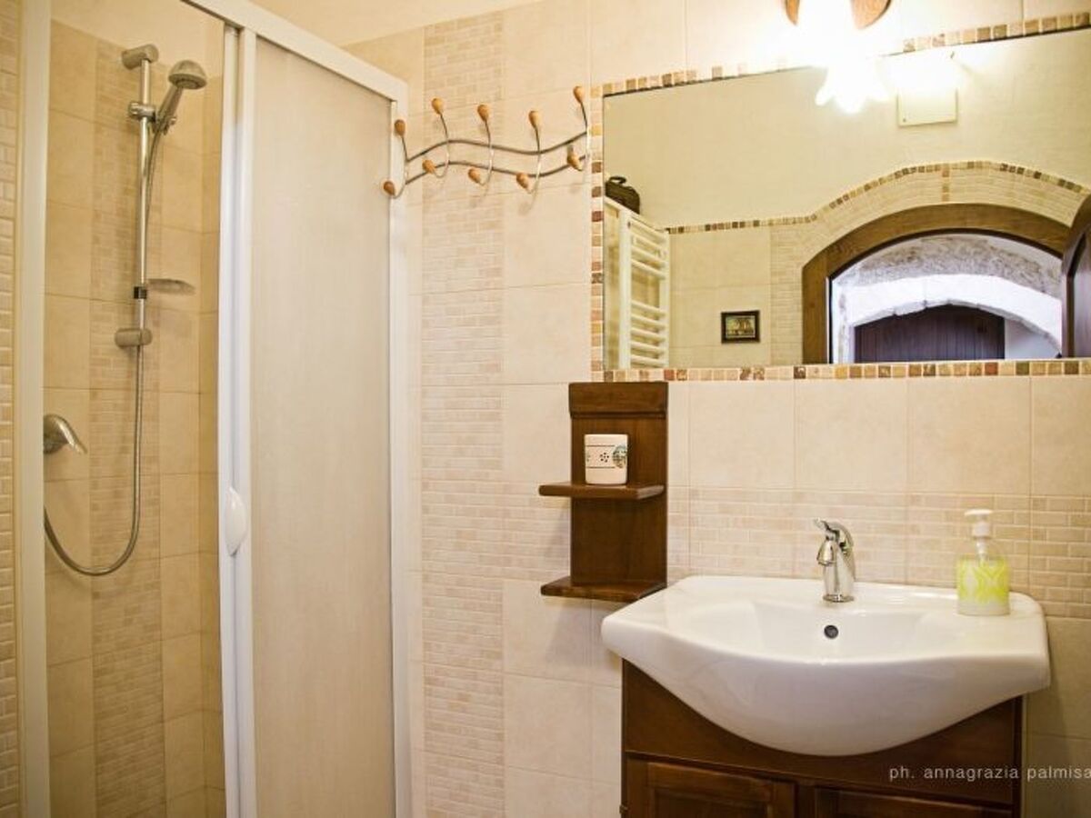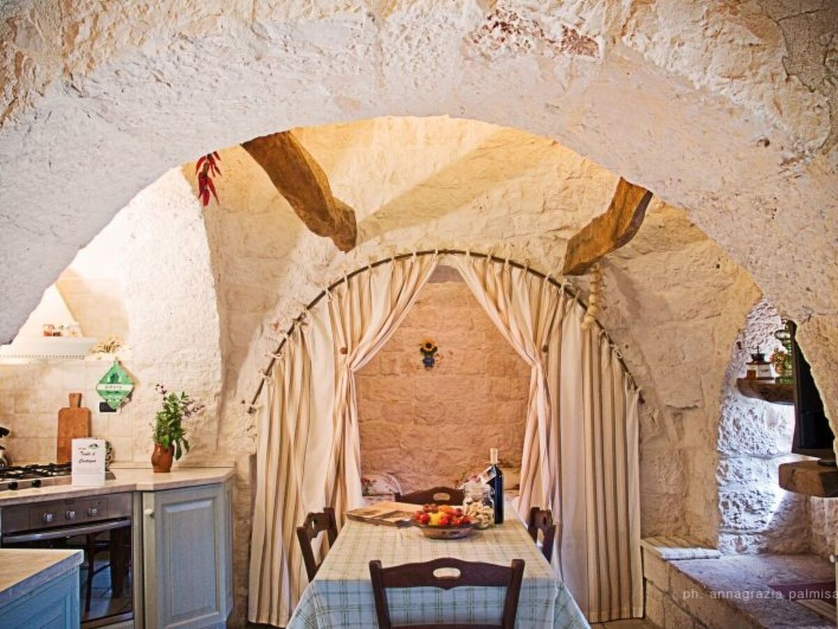 The trullo also consists of: a large bathroom, furnished in arte povera style, with shower; the kitchen equipped with four burners, electric oven, a set of plates, glasses and cups, crockery, pots, pans, coffee moke, tea kettle, fridge with freezer, and much more; satellite TV; international collection of books to exchange; private outdoor shaded area with wooden table and chairs.