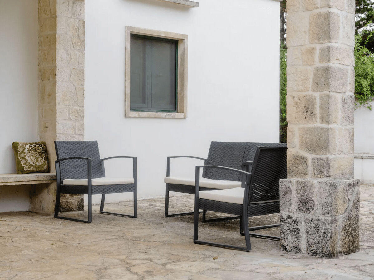 This is the actual living area of the house, with a hand-painted tiled table, a wicker seating area, a sun terrace near the traditional stone well and a barbecue.