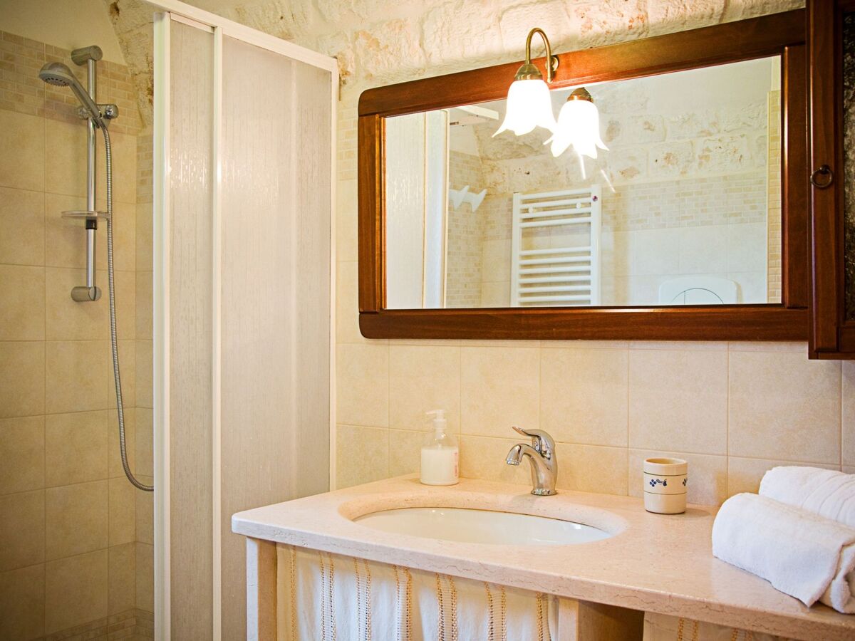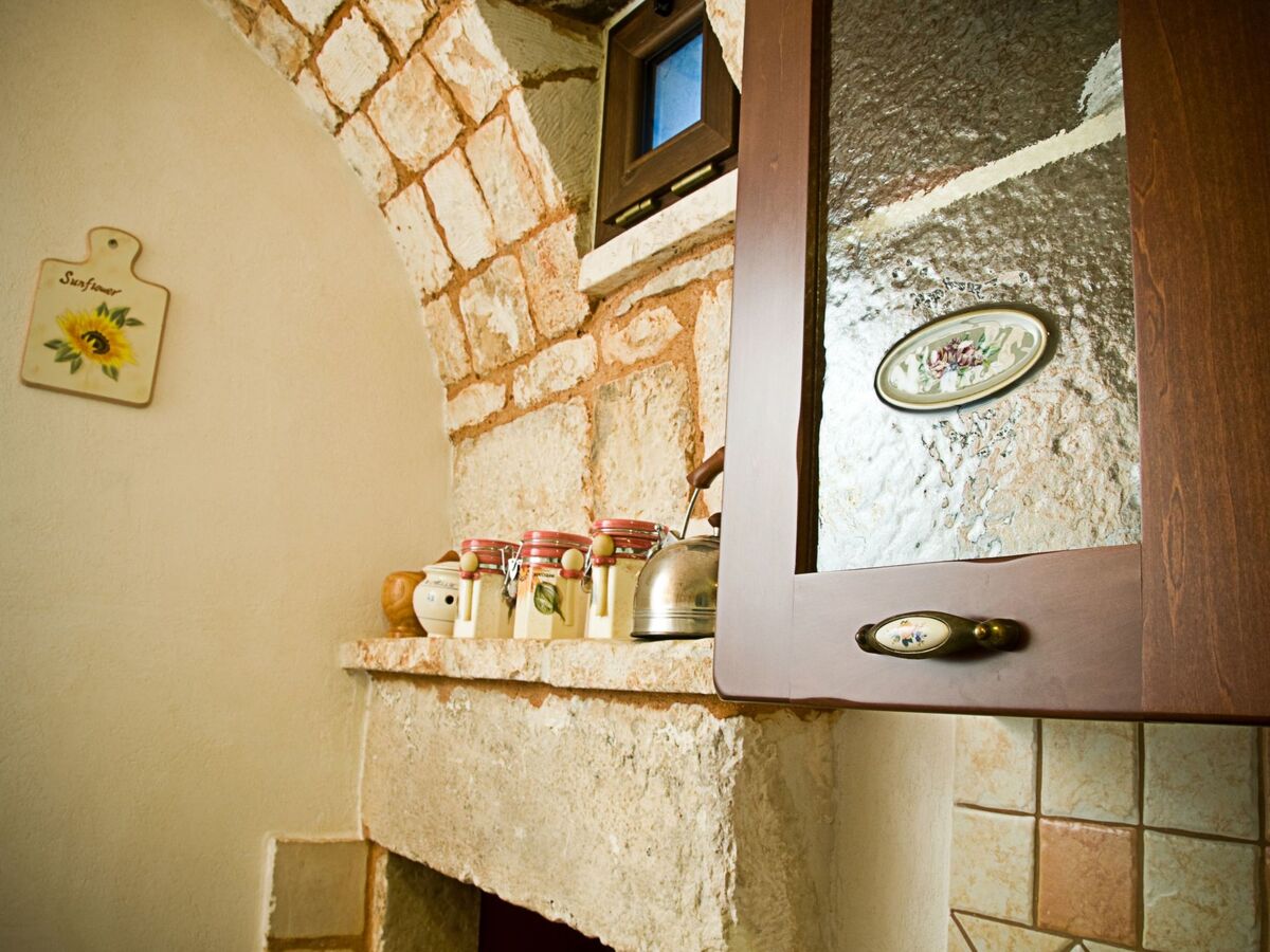 The trullo also has: a large bathroom, furnished in arte povera (poor art), with shower; the kitchen equipped with four burners, electric oven, a set of plates, glasses and cups, crockery, pots, pans, coffee mocha, tea kettle, refrigerator with freezer, and much more; the double bedroom with wardrobe with the largest trullo cone in the building; satellite TV; international collection of books to exchange; private outdoor shaded area with wooden table and chairs.