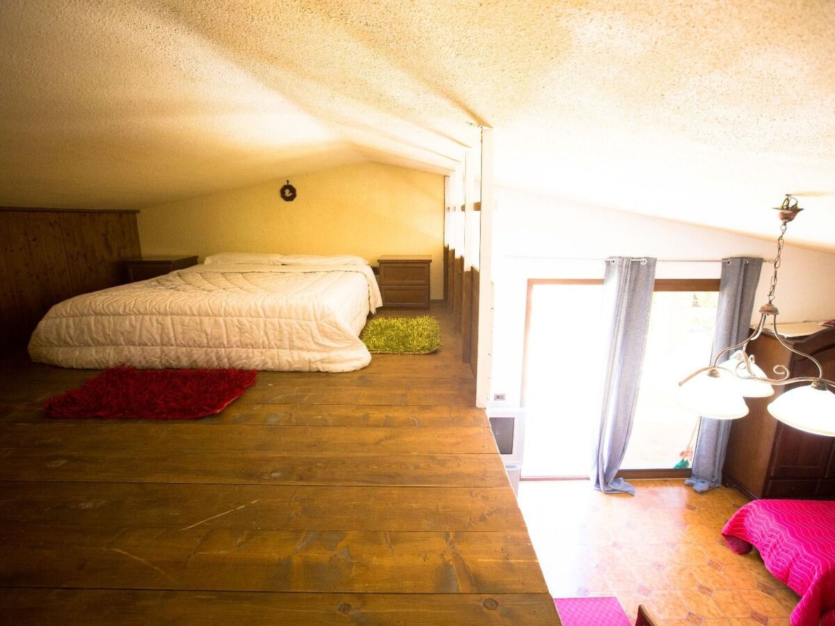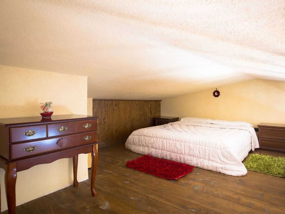 From here, a wooden staircase leads to the mezzanine with the sleeping area and a double bed.