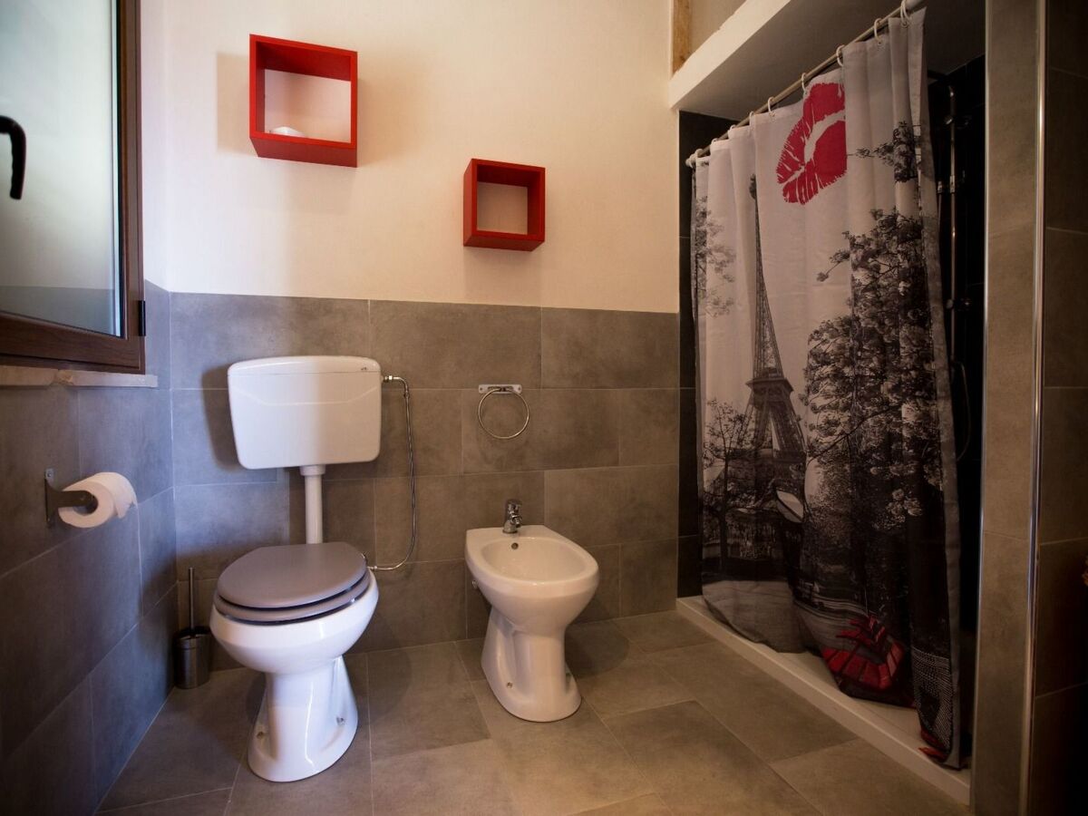The bathroom is equipped with a shower, bidet and hairdryer.