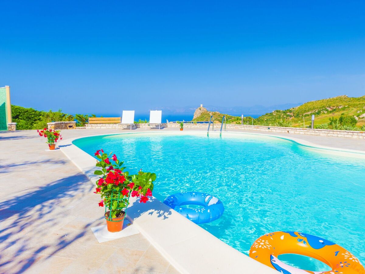 There is a beautiful outdoor area with a large swimming pool and a large open space.