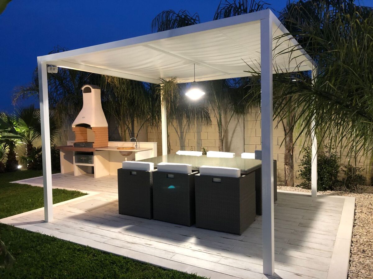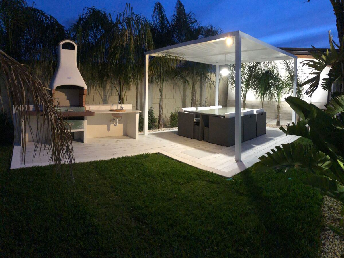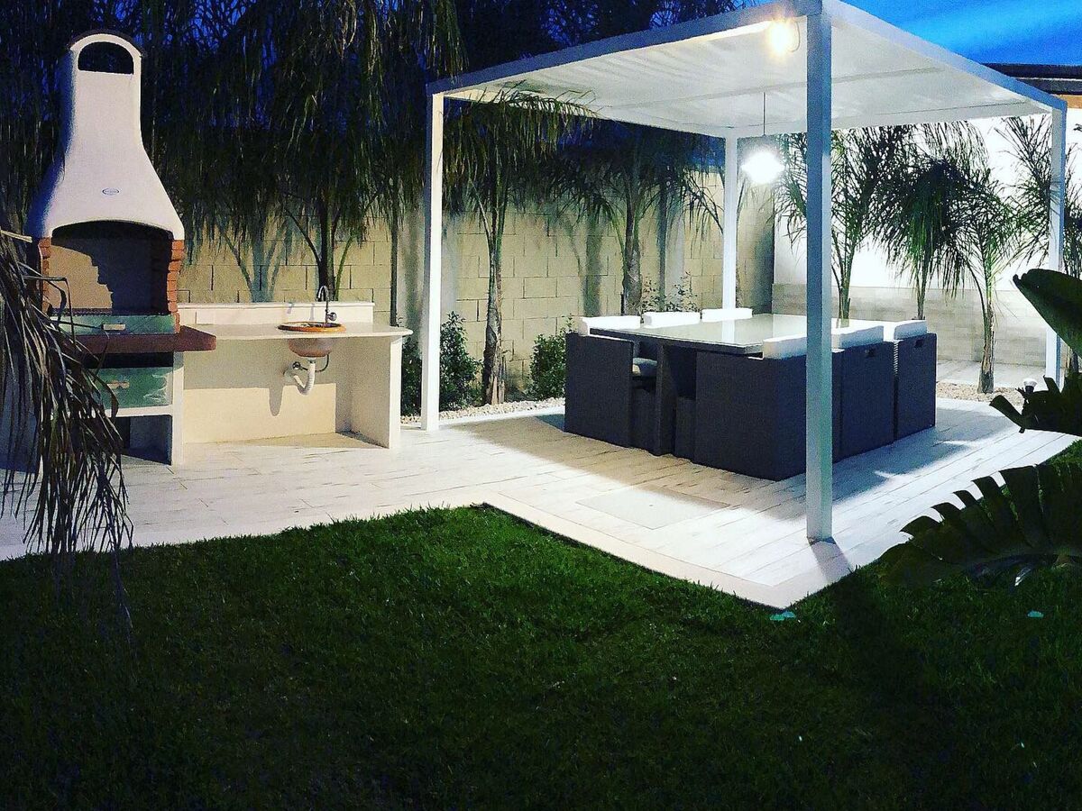The outdoor area has a large relaxing sofa, a gazebo with table and chairs, and a barbecue.