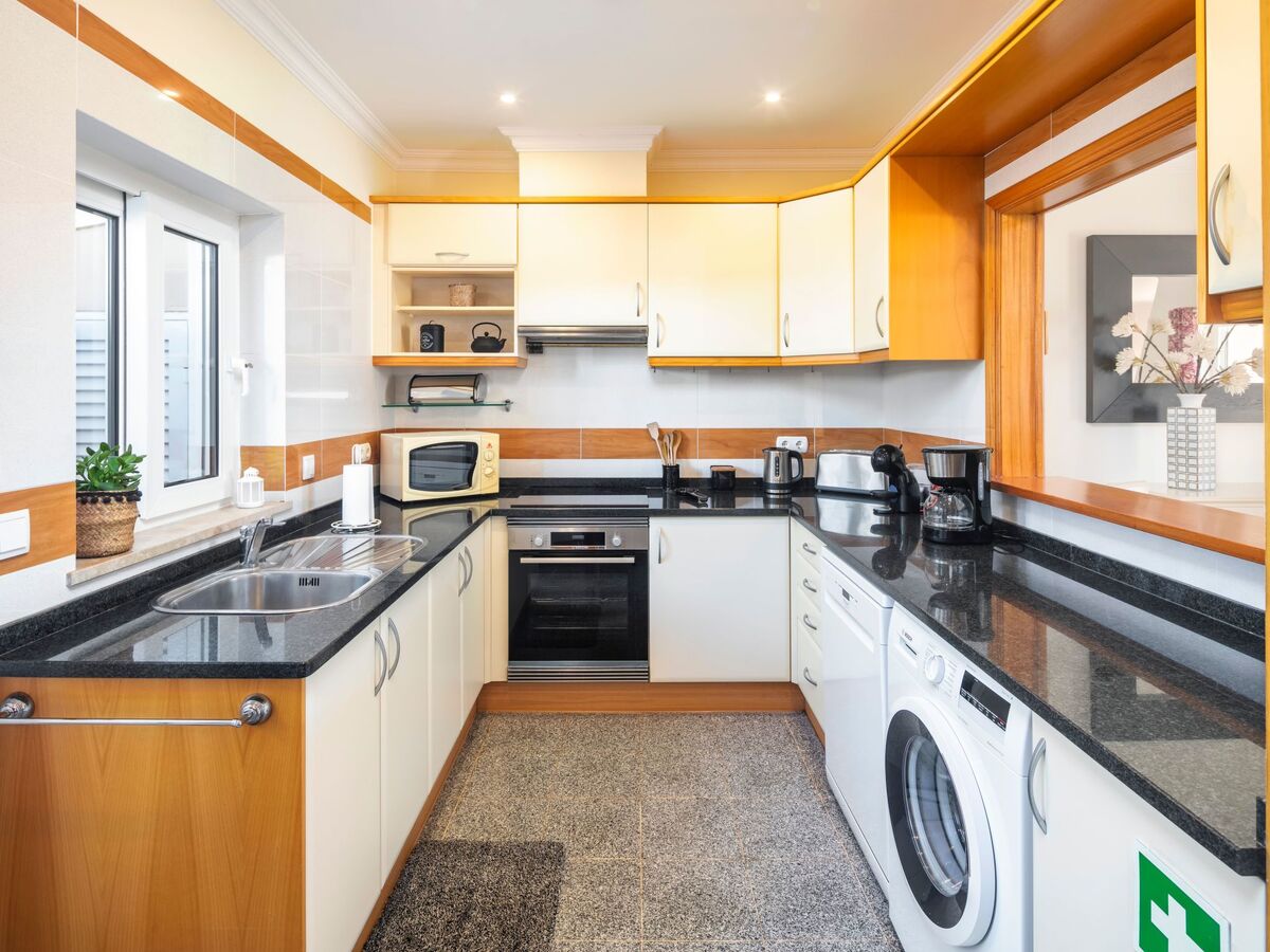 La cuisine est entièrement équipée avec un lave-vaisselle, un lave-linge, un réfrigérateur, une plaque de cuisson électrique, un four, un micro-ondes et un grille-pain.