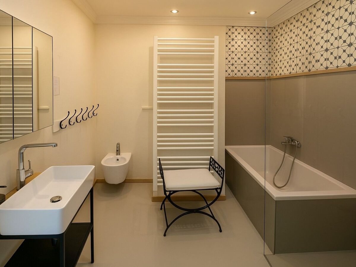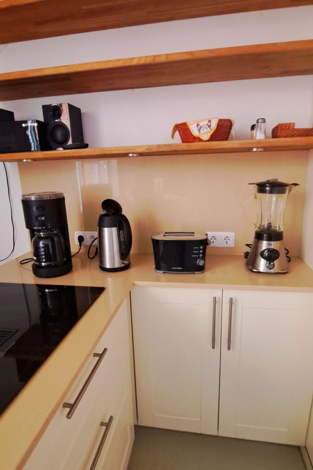 The kitchen is very well equipped with dishwasher, washing machine, ceramic hob, oven, microwave, kettle, coffee machine, toaster and large fridge incl.