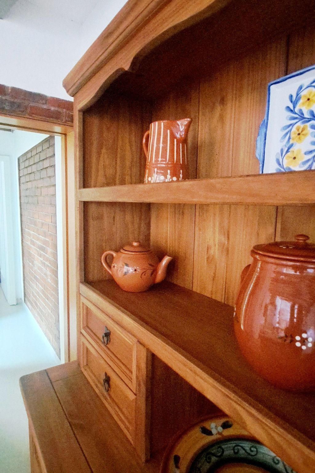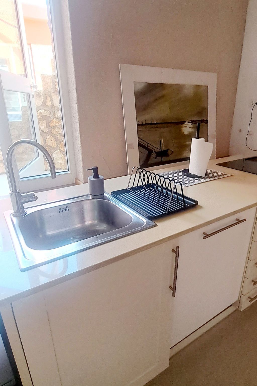 The kitchen is equipped with pots, crockery, cutlery and some kitchen utensils, such as cooking spoons, spaghetti spoons, can opener, grater, garlic press, Tupperware.