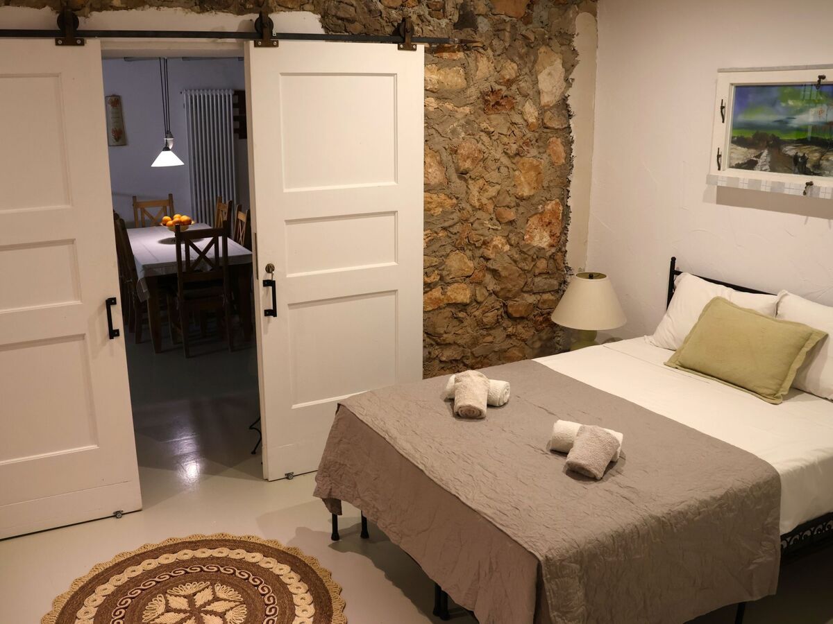 A room with a metal double bed (140 cm) and a sofa bed (for 2 people) is separated from the kitchen by a sliding door.