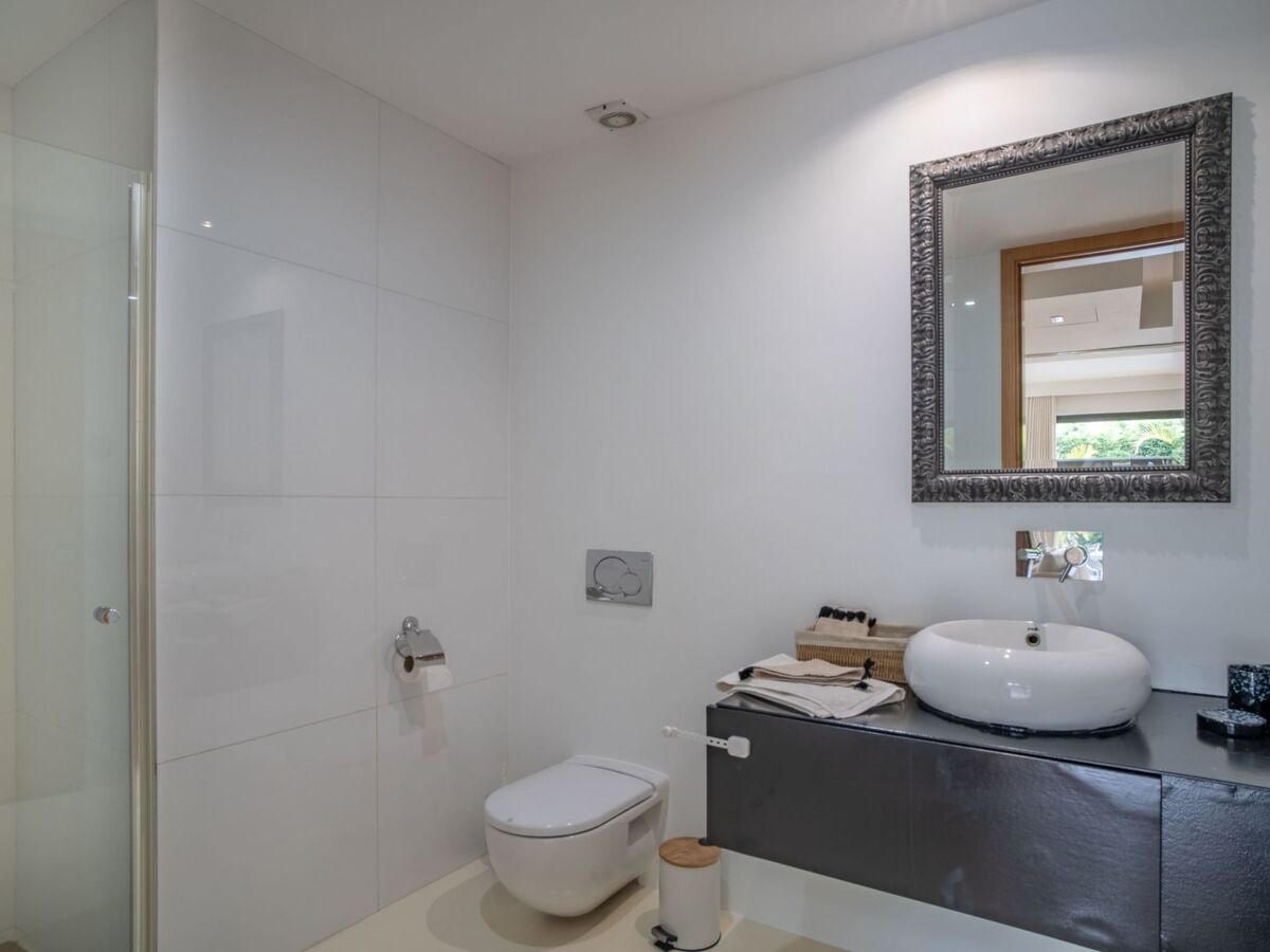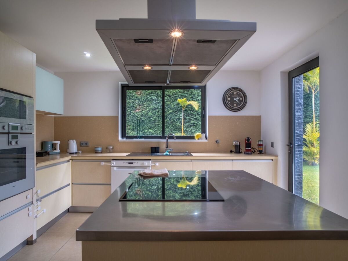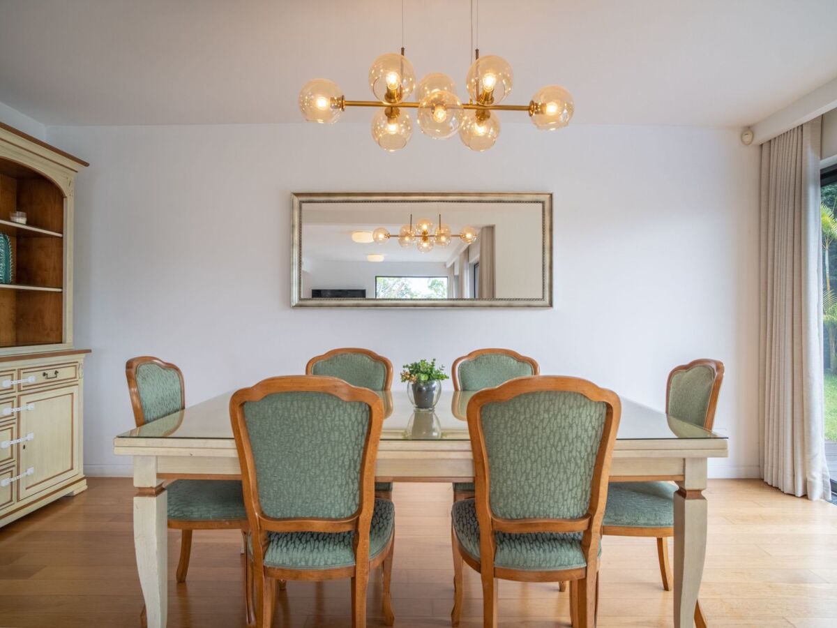 Outside the house, there is a beautiful garden with lawn and tropical plants and a delightful swimming pool.