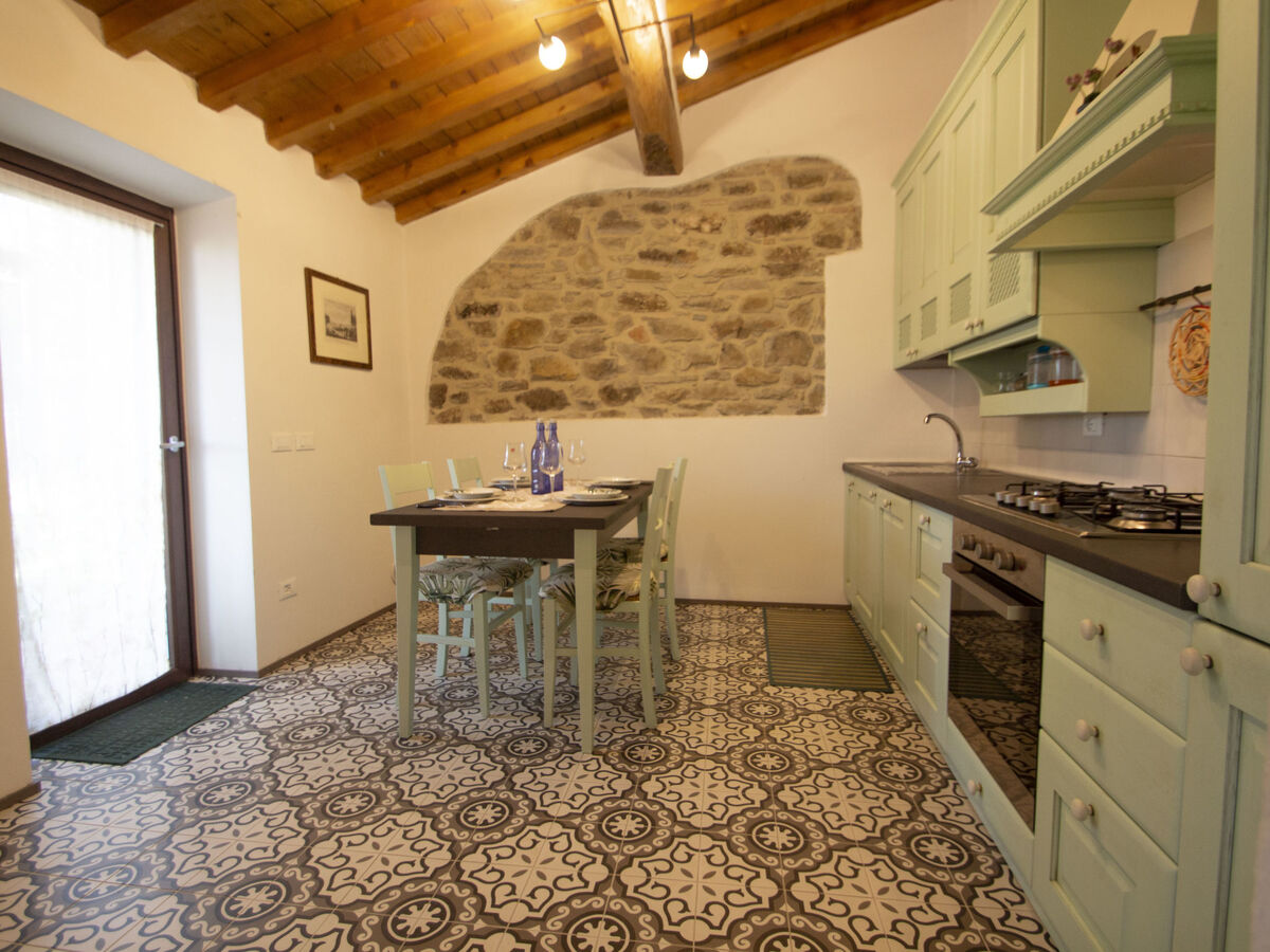 Cuisine/séjour (four, lave-vaisselle, Poêle à gaz, 5 feux, bouilloire électrique, congélateur, cafetière électrique) avec table pour les repas.