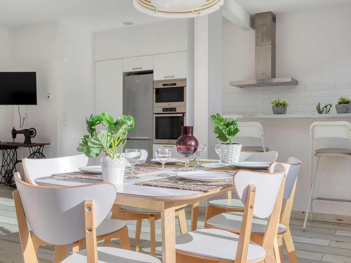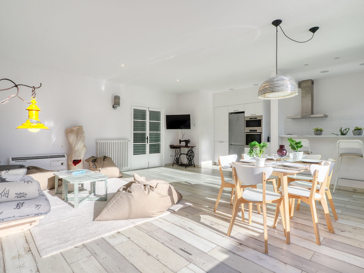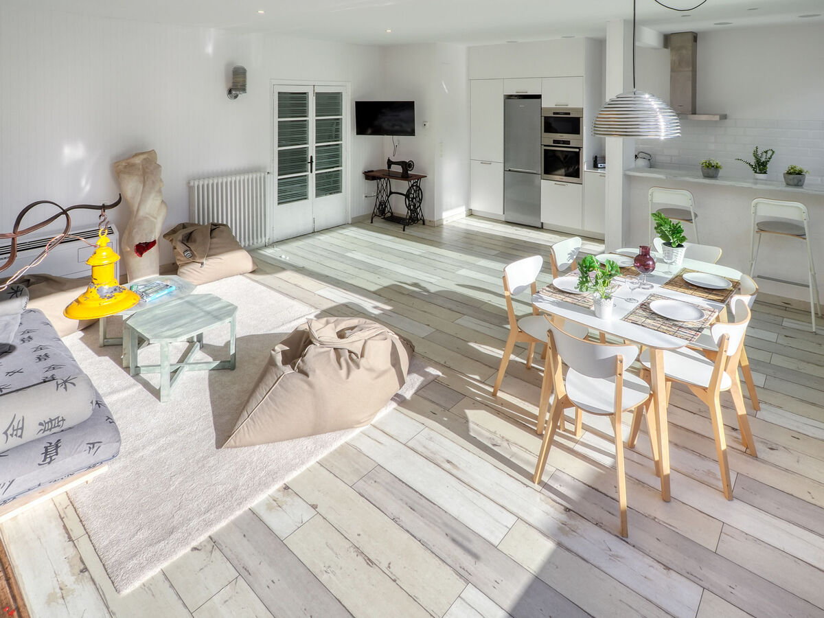 Clair, aménagement moderne et de style: séjour/salle à manger avec table pour les repas, TV (satellite), chauffage a gaz, air-conditionné et chauffage à air chaud.