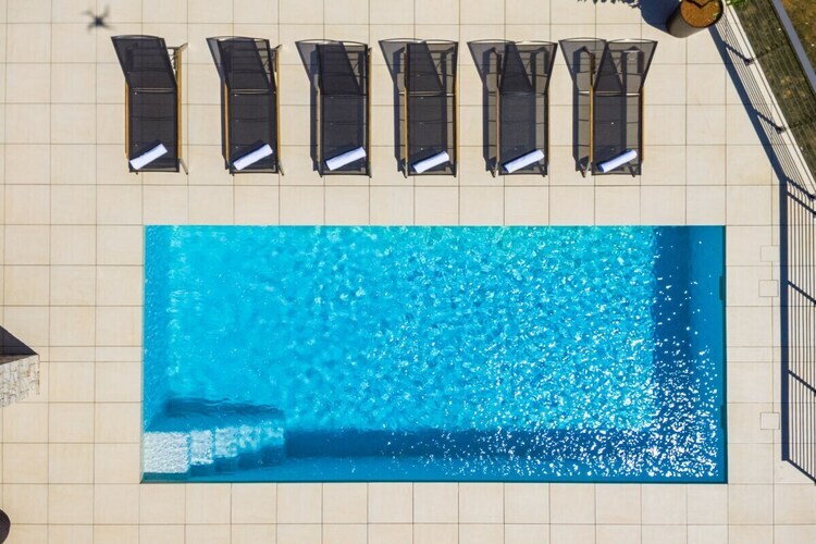 La superbe terrasse dispose d'une grande piscine chauffée, de transats et d'un barbecue au charbon de bois. La villa comprend également deux places de parking privatives.